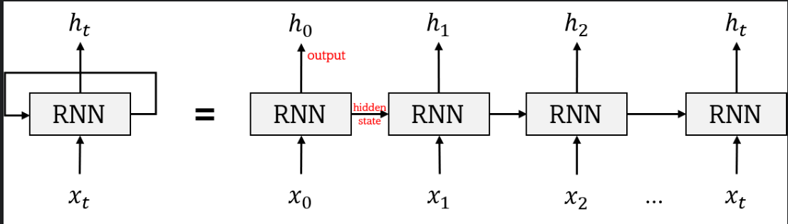 * RNN의 동작 방식은 위의 그림과 같이 입력을 받으면 은닉벡터를 생성한다.