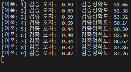 print("[이폭: %d] 검증 오차: %5.2f │ 검증정확도: %5.2f" %(e,val_loss, val_accuracy))