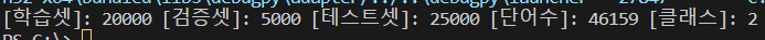 print("[학습셋]: %d [검증셋]: %d [테스트셋]: %d [단어수]: %d [클래스]: %d" %(len(trainset), len(valset), len(testset), vocab_size, n_classes))