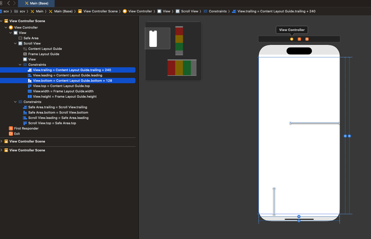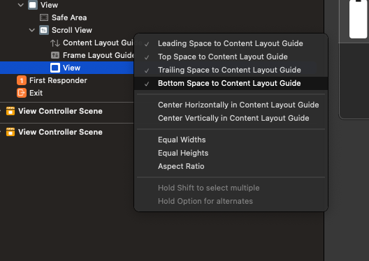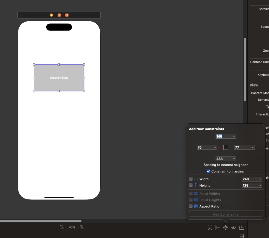 스크롤 뷰의 제약 조건을 추가합니다. 'Constrain to margins' 옵션은 해제합니다.