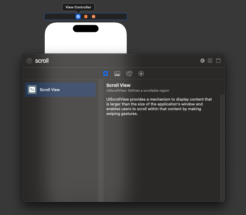 Xcode의 스토리보드에서 Object Library를 열고 ScrollView를 검색합니다.