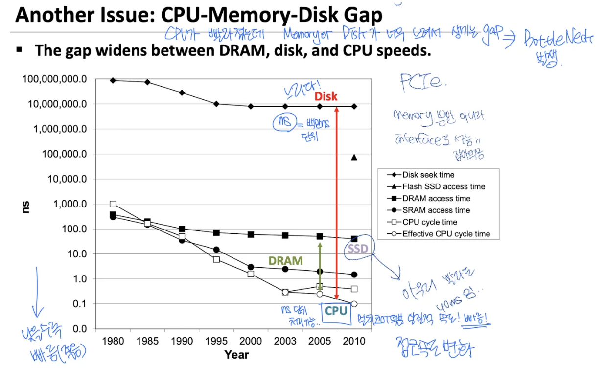 • HDD는 수백만 ns 지연 → 병목 극심