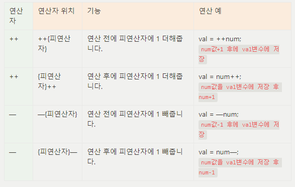 int val = ++a + b--; // a 는 연산전에 +1, b 는 연산후에 -1