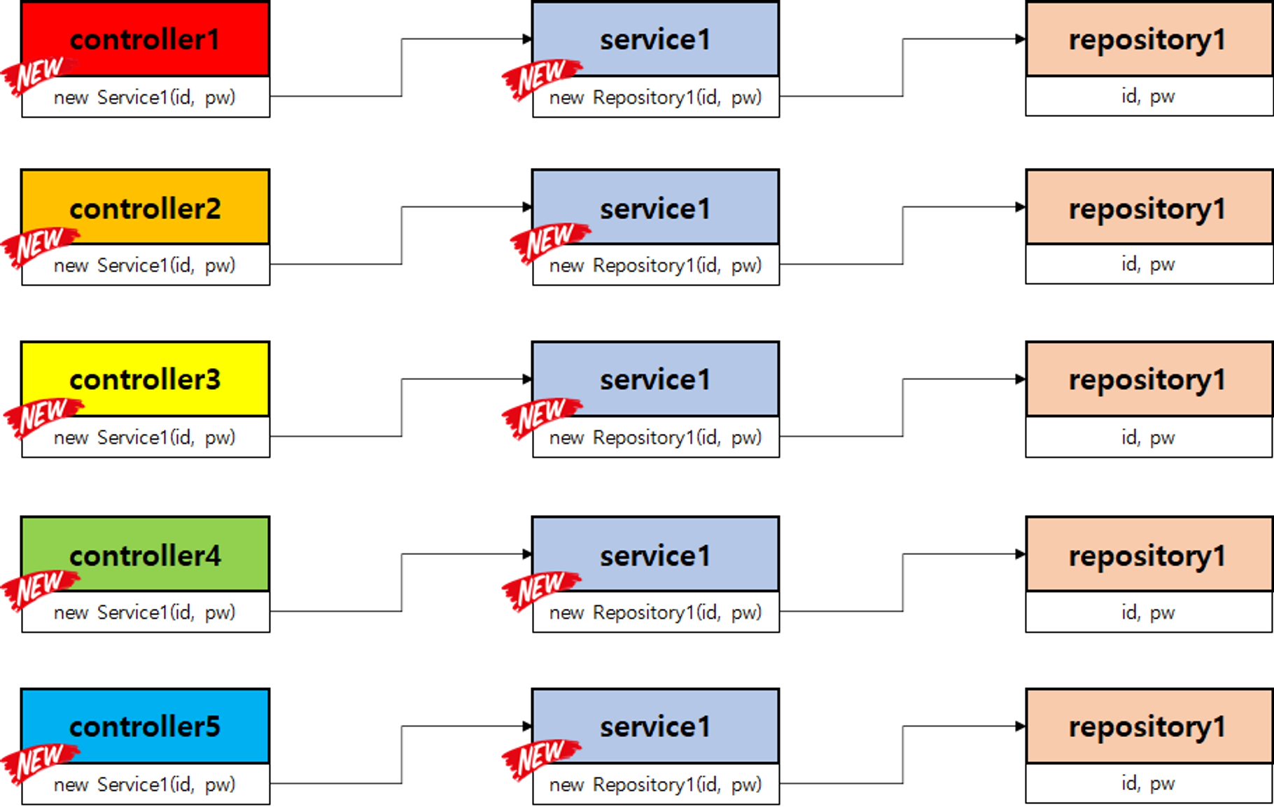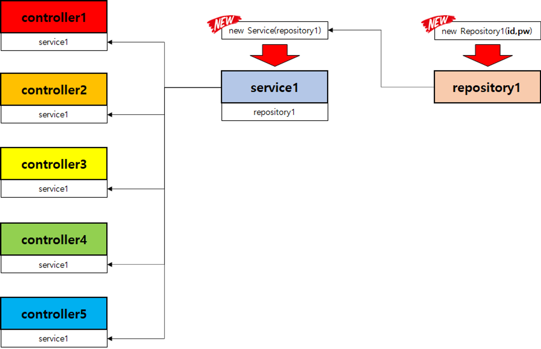 보μ΄λ κ²κ³Ό κ°μ΄ Controller1 κ°μ²΄λ μμ±λ λ Service1 κ°μ²΄λ₯Ό μΈμ€ν΄μ€νν΄μ μ¬μ©νλ€. μ¬κΈ°μ λ§μ½ Controller1 κ°μ²΄μ μ¬λ¬κ°μ§ λ©μλλ€μ΄ Servicee1 κ°μ²΄λ₯Ό μΈμ€ν΄μ€ν ν΄μ μ¬μ©νλ€λ©΄ μ½λμ μ€μ κΈΈμ΄μ§κ³ , Service1 κ°μ²΄μ λ³κ²½μ¬νμ΄ μκΈ°λ©΄ κ³ μ³μΌν λΆλΆλ λ§μ κ²μ΄λ€. λ μ μ μλ μ μ μ½λμ κ΅¬μ‘°λ‘ μΈν΄ Controller1 κ°μ²΄λ Service1 κ°μ²΄μ μμ‘΄μ νλ€λ κ²μ΄λ€.