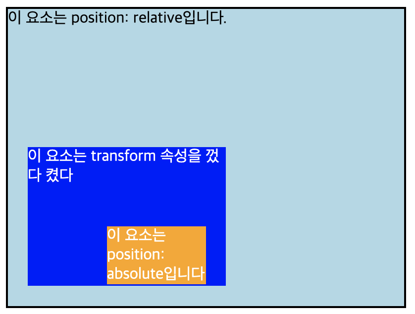 inline-block, block, list-item 등)의 콘텐츠 영역 경계table, flex, grid, 또는 블록 컨테이너 자기 자신position 속성이 static 이 아닌 가장 가까운 조상의 내부 영역inline 일 때: 패딩을 포함한 콘텐츠 영역을 따라 위치가 지정됨inline 이 아닐 때: 패딩을 제외한 콘텐츠 영역 경계를 따라 위치가 지정됨transform, perspective, fillter 속성이 none이 아닌 것will-change 속성이 transform 이나 perspective 인 것will-change 속성이 filter 일 때도 적용contain 속성이 paint 인 것예제를 통해 position: absolute의 컨테이닝 블록이 transform 속성에 따라 달라지는 것을 살펴보자.