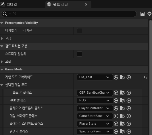 게임 모드 오버라이드를 방금 만들어 준 게임모드로 설정하고 디폴트 폰 클래스를 이주해 온 CBP_SandboxCharacter 선택