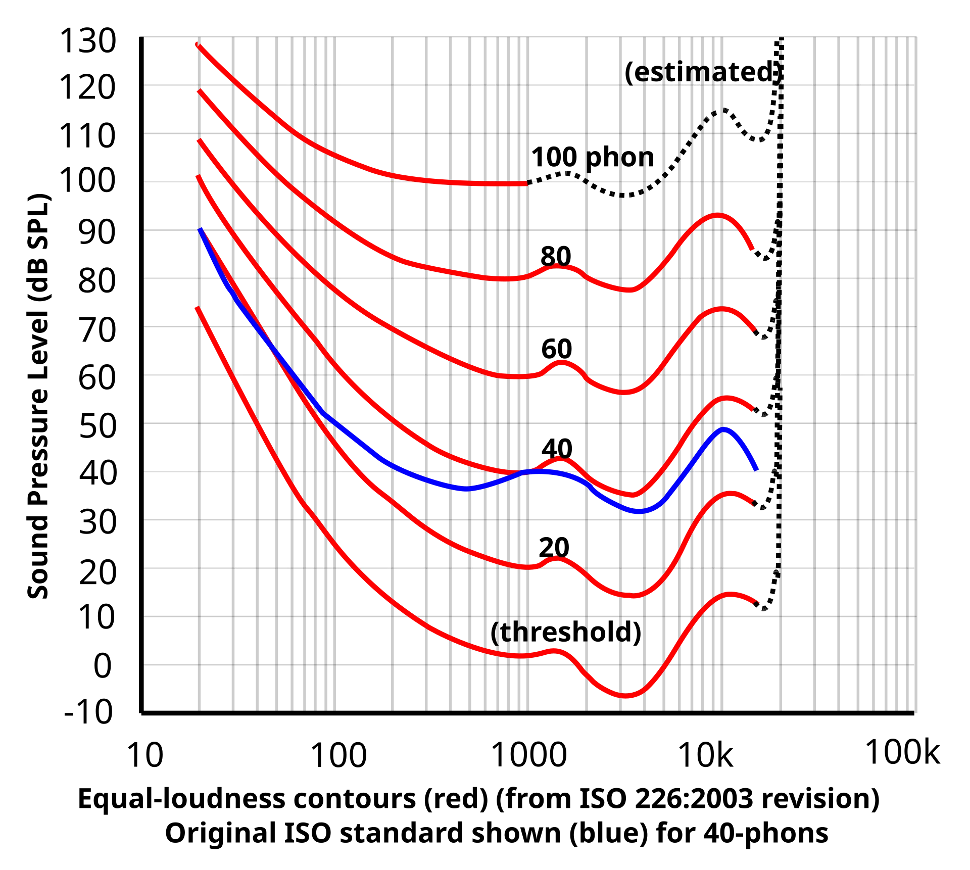 주파수에 따라 사람이 느끼는 음압이 다르다는거다. 위 그래프를 대충 해석하자면 한 곡선위의 점들은 사람이 같은 음압으로 인식한다는 것이다. 저음에서는 실제 음압을 와방 올려줘야 좀 같게 느끼고 (베이스 연주자의 비애), 사람의 목소리가 포함되는 중음역대는 민감하게 반응해서 또 더 잘듣는다. 사람의 소리 인식은 선형적이지 않다.