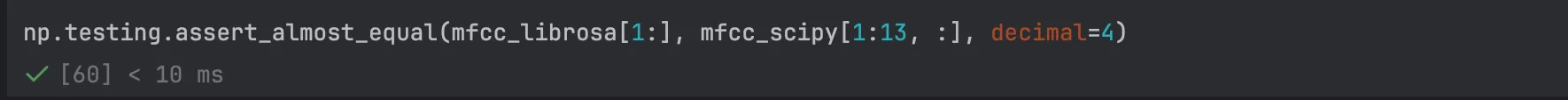 실제로 값이 같은지 확인을 해보면, DC 성분에서 차이가 꽤 크게 나와 값이 비슷하지는 않다. DC 성분은 전체 평균 에너지값을 대표하다보니 로그 변환방식, 정규화 차이등으로 인해 차이가 생길수도 있고, librosa는 목적이 확실하다 보니 실제 계산 이후에 normalization이나 필터 보정이 추가되었기 때문으로 보인다.