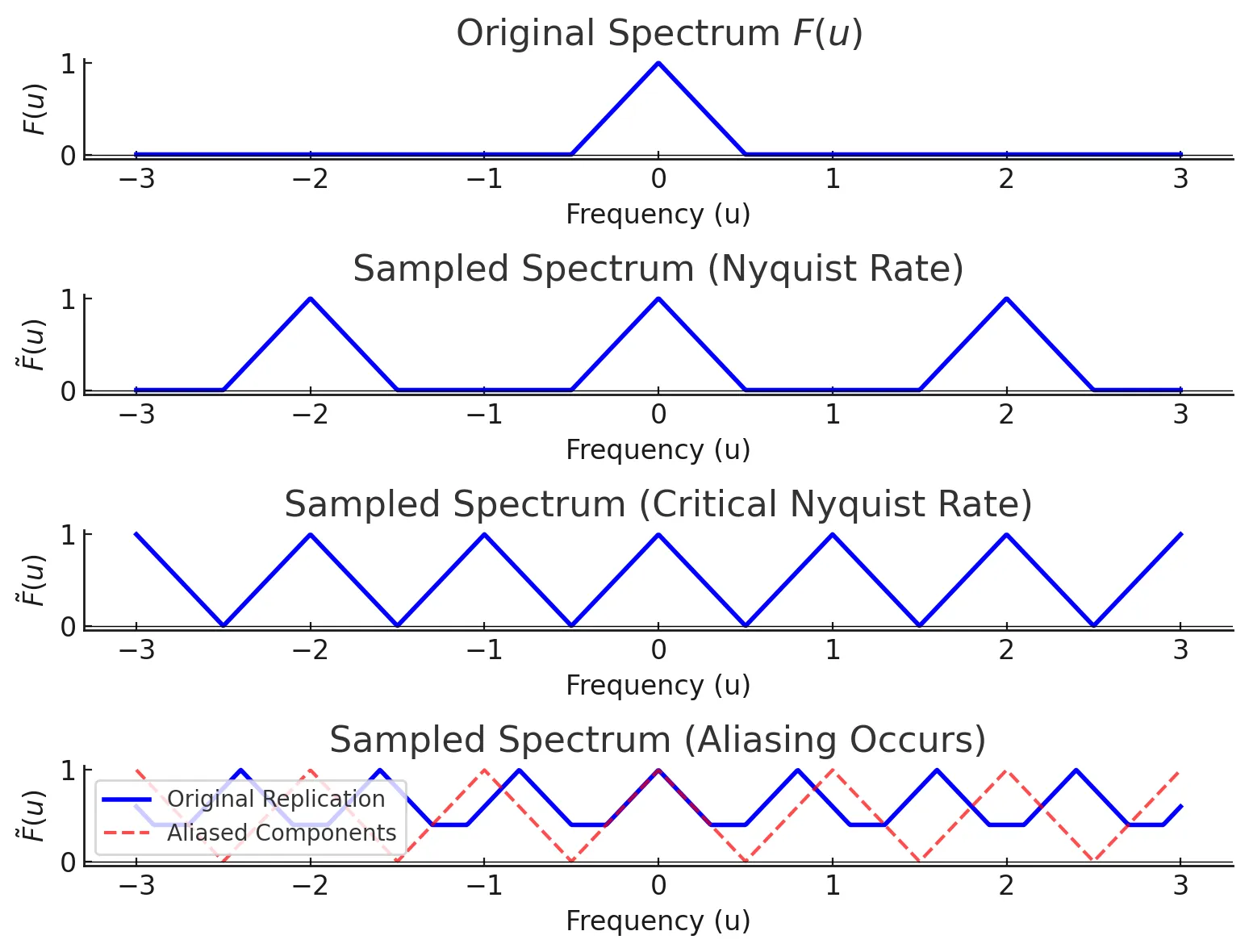 샘플링 레이트 1/ΔT 가 충분히 크다면 문제가 없는데, 샘플링 레이트가 작아버리면 맨 아래처럼 주파수 도메인에서의 신호가 겹쳐버리고, 원래 신호를 복원해내기 어려워진다. 이렇게 겹치는 현상을 aliasing이라고 한다.