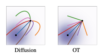그리고 본 논문에서는 이렇게 확률경로 및 벡터 필드가 직선경로를 따르게 하여 훨씬 효율적으로 샘플링 수행을 할 수 있다고 보여준다.