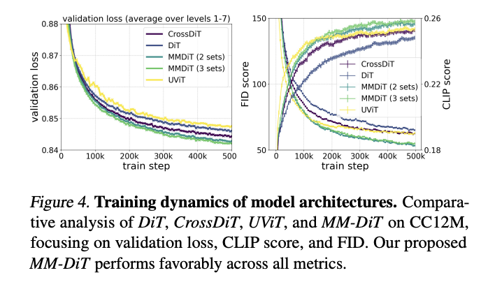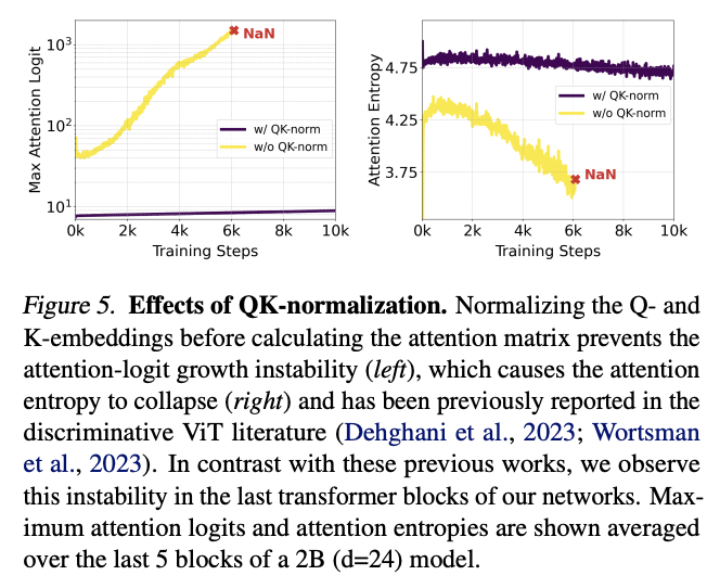 보통 학습할때 256^2 의 저해상도에서 pretrain 후 고해상도 이미지를 학습하는데, 고해상도에서 mixed-precision 으로 훈련하는게 불안정해지고 loss가 발산해버리는 현상이 나타났다. 그렇다고 차마 full-precision을 쓸수는 없어 (실제로 성능 반갈죽 당했다고 함) 다른 선행 연구를 참고하였다. 선행 연구에서는 large ViT가 발산하는게 attention entropy가 폭발해버리기 때문임을 보았고, 이에 따라 attention 계산 전에 Q, K 값을 정규화 때려버려서 해결하였다. 그래서 요걸 따라서 RMS Norm을 추가하였다. MM-DiT 블록 그림내 Opt. RMS-Norm이라고 써진게 그거다.