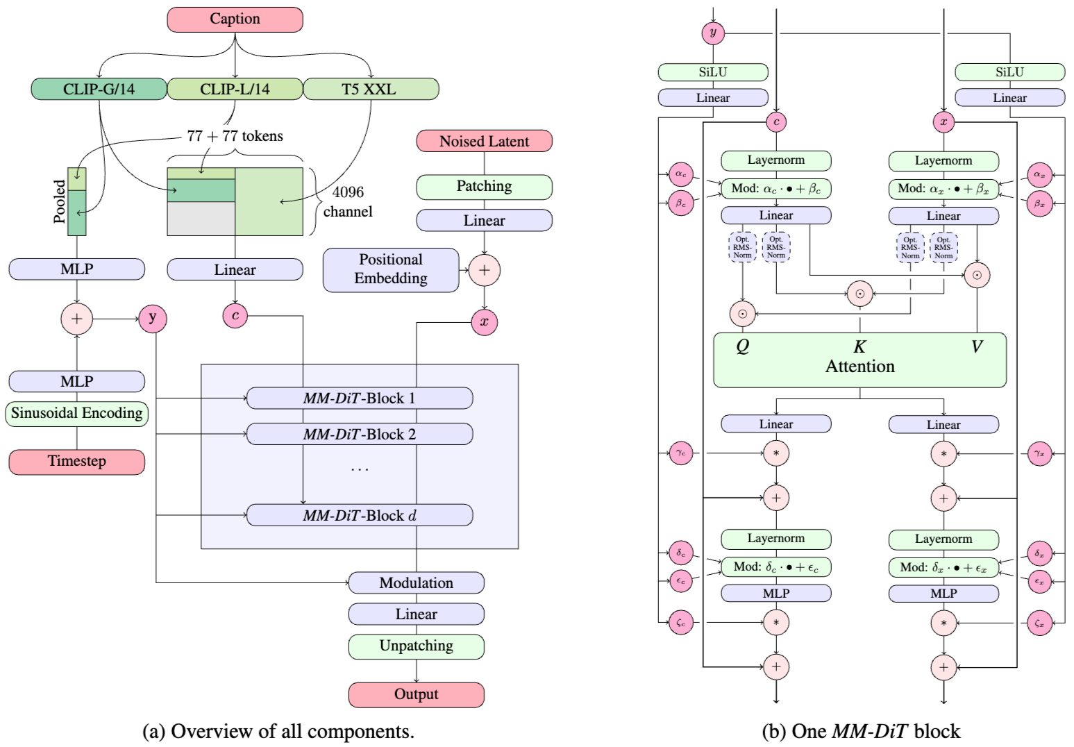 약간 더 구체적으로, CLIP 모델 두개에서 나온 pooled output을 이어 붙여서 을 만들었고 이건 기존 DiT 에서 활용한것과 같은 형태라고 한다. 다만, CLIP에서 압축된 표현만 사용하기엔 좀 모잘라서 T5 인코더까지 빨아서 도 만들었다고 한다.