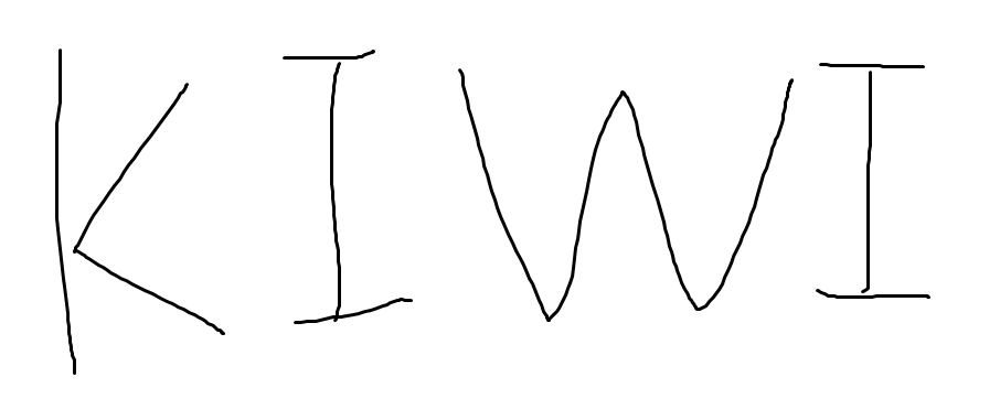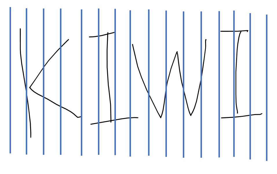 손글씨를 일정한 간격으로 자른다고 할 때 K는 4칸, W는 5칸, I는 3칸을 차지한다.