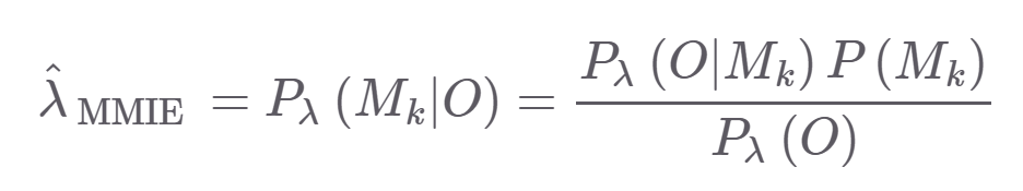 다음은 MLE식이다. 람다는 구하고자 하는 파라미터이고 , O는 mfcc같은 feature , M_k는 은닉마코브모델의 상태인 subphone의 sequence이다.