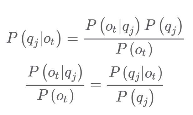 첫번째 줄의 식은 우변과 같이 우리가 HMM-GMM구조에서 알고 있는 hidden state에 대한 우도로 나타낼 수 있다. 이때 P(o_t)는 관측된 sequence이고 상태와 관계없이 모두 동일하기에 디코딩에 영향 미치지 않는다.
