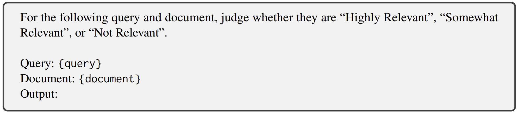 따라서 LLM 한테 zero shot으로 fine-grained relevance label을 주려고 한다. 'highly relevant' , 'somewhat relevant' , 'not relevant' 여기서 likelyhood score를 모은다.