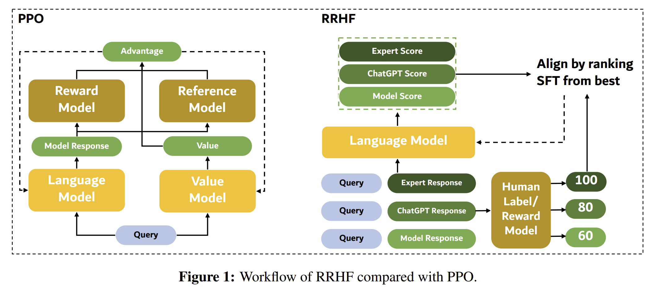 그래서 우리는 RRHF를 제안한다. 이는 rank loss에 의해서 사람의 선호도에 따라 다양한 답변을 align하고 성능을 보존한다. 훈련 전에 RRHF는 다양한 source(다른 LLM, self , human response 등)로부터 답변을 모은다. 그 다음 다양한 답변을 training model의 log probability를 기반으로 평가한다. 그 다음 점수는 사람 선호에 대한 reward model이나 ranking loss에 의해서 align된다. 우리는 절대적 점수 대신 ranking을 선택한다.