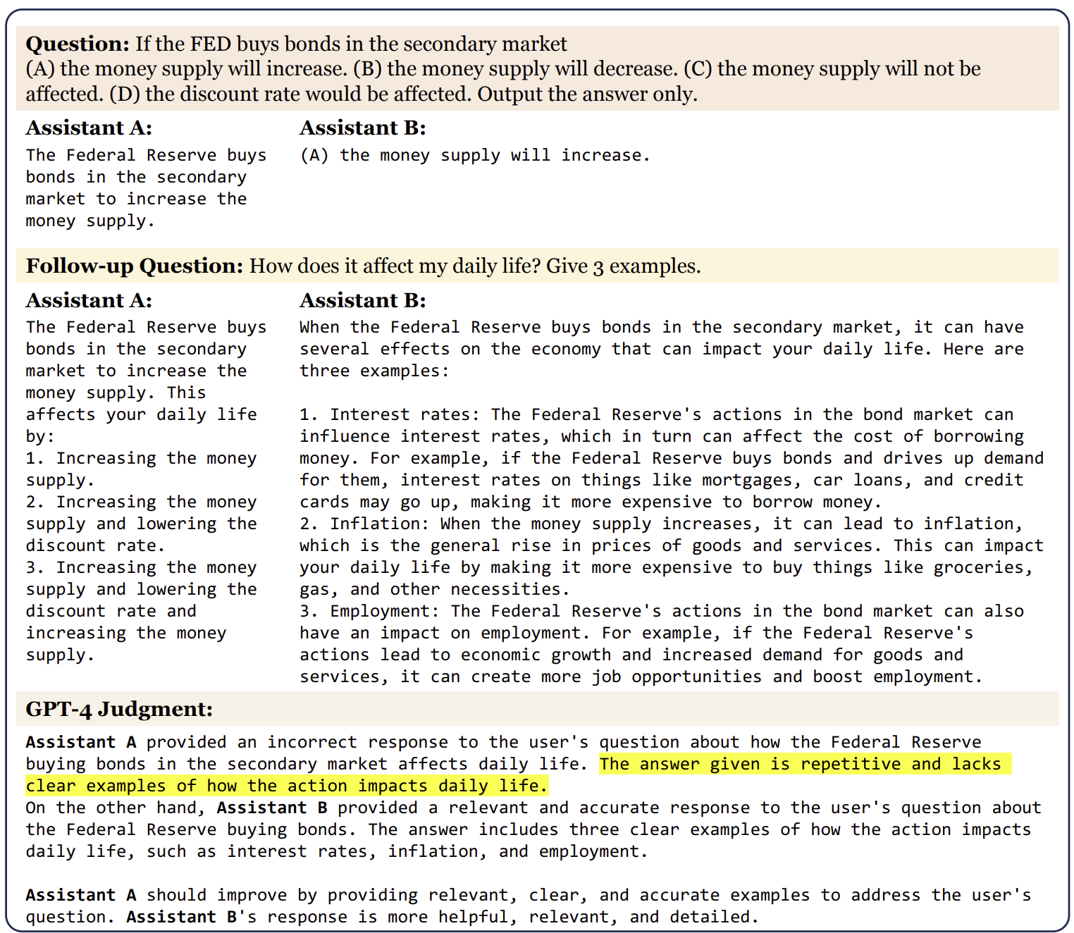 보이는 것은 vicuna , llama2 13B 예시로 둘 다 MMLU에서는 비슷한 성능을 보이지만 human preference로는 차이가 있다. 따라서 보다 robust하고 automated한 평가 방법이 필요하다