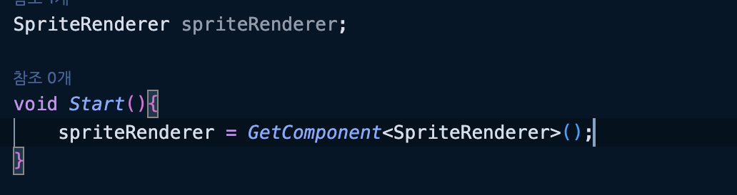 2.spriteRenderer를 가져와 색을 바꾸기 위해 spriteRenderer를 담을 변수와 strat 함수에서 시작하자마자 오브젝트의 spriteRenderer 컴포넌트를 변수에 넣기