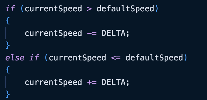 update 함수에 기본 속력이 아니면 현재 속도가 기본 속도보다 높은지 낮은지를 체크해서 원래 속도로 되돌리는 코드 추가
