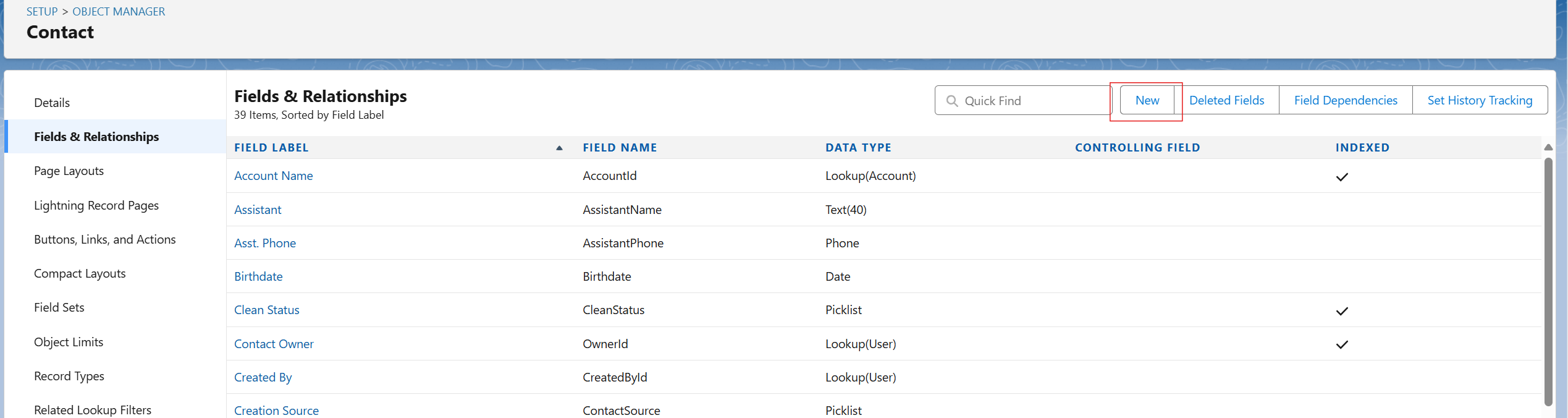 여기서 Field & Relationships를 선택하면 연락처 항목에 포함된 모든 필드들을 확인할 수 있는데요