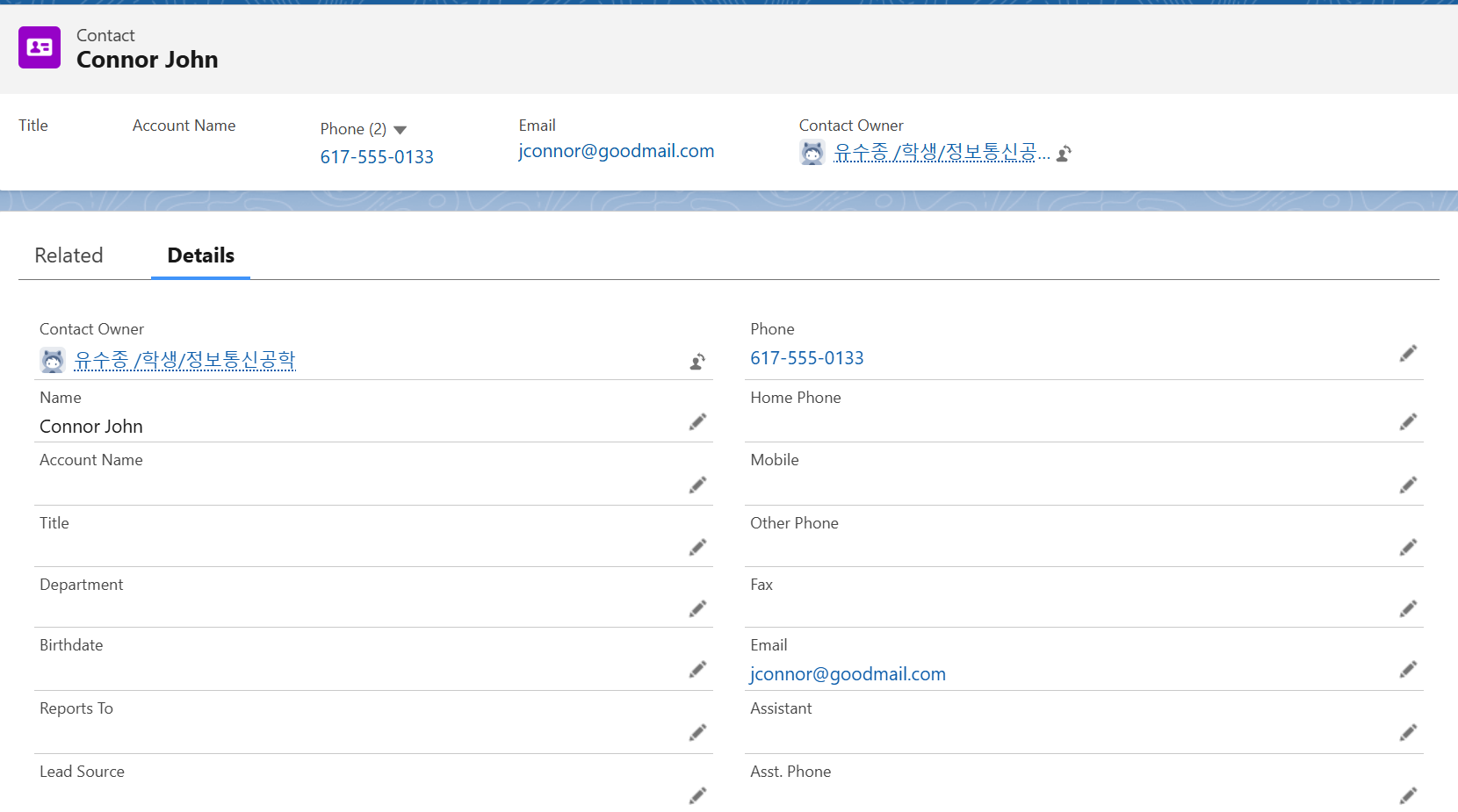 이제 연락처에 샘플데이터가 생성되는데요, 여기서 아무 연락처를 고른다음 세부 정보를 확인해줍니다.