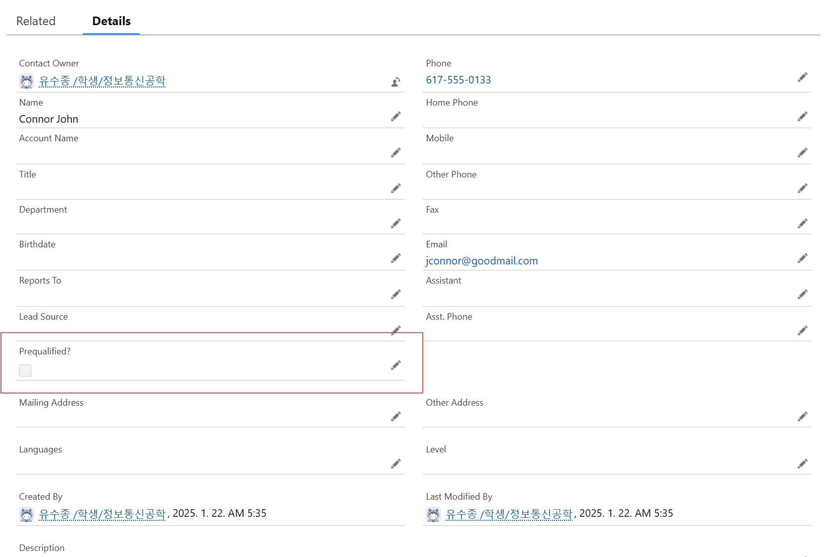 돌아와서 확인해주면 Prequalified? 라는 체크박스 형식의 필드가 추가되었음을 확인할 수 있습니다.