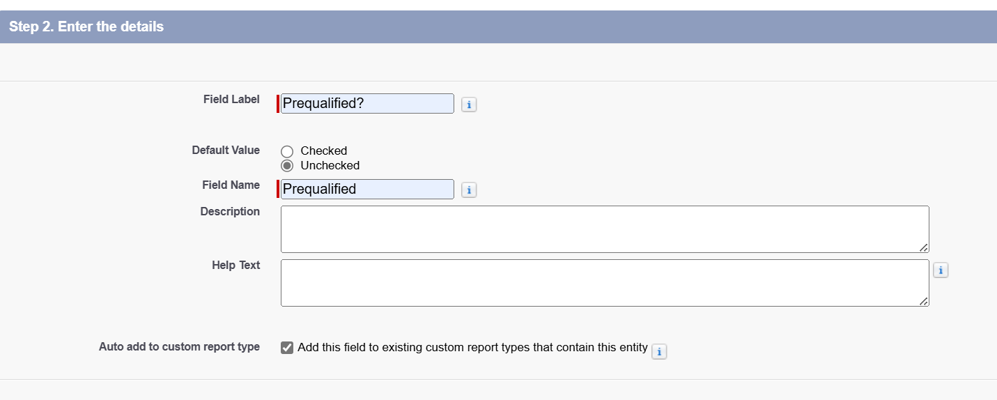 두번째 스텝으로 넘어가면 필드의 라벨, 이름, 디폴트값, 설명 등등을 설정할 수 있습니다. 대출가능 여부이기 때문에 Prequalified? 로 지었습니다.
