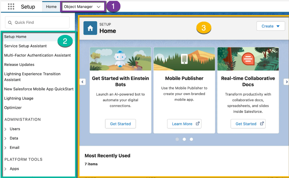 Setup(설정) 메뉴에는 Administration(관리), Platform Tools(플랫폼 도구) 및 Settings(설정)의 세 가지 주요 카테고리에 대해 알아보겠습니다.