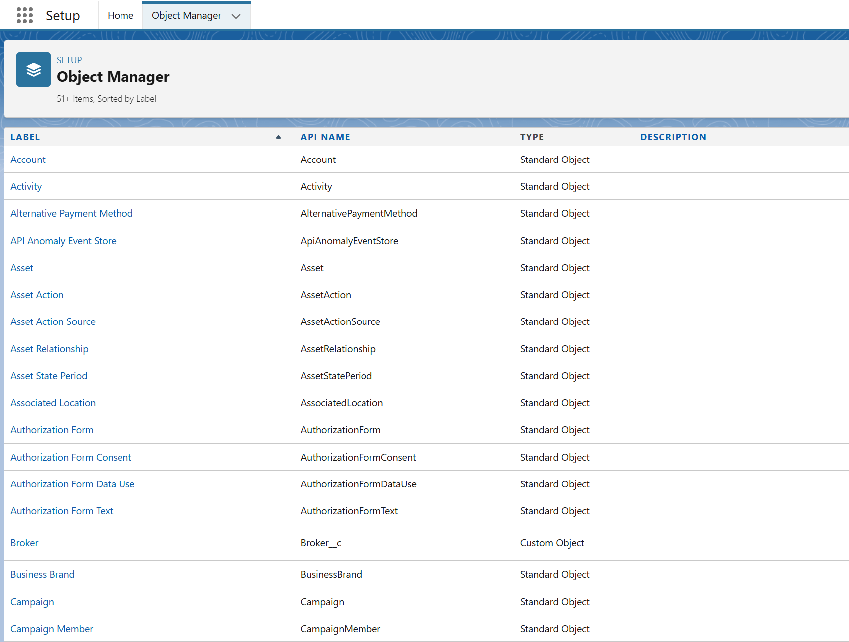 여기서 Home 옆에 있는 Object Manager를 선택해주면 다양한 오브젝트를 관리할 수 있는데요, 저희가 원하는건 연락처 관리니까 Contact를 선택해줍니다.