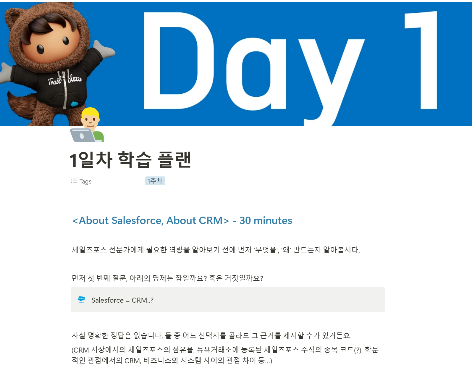학습 플랜은 하루 분량의 학습 과제를 노션으로 정리해서 제공되며 1) About CRM, 2) Trailhead Study, 3) Basic IT Programming 등으로 구성되어있습니다.