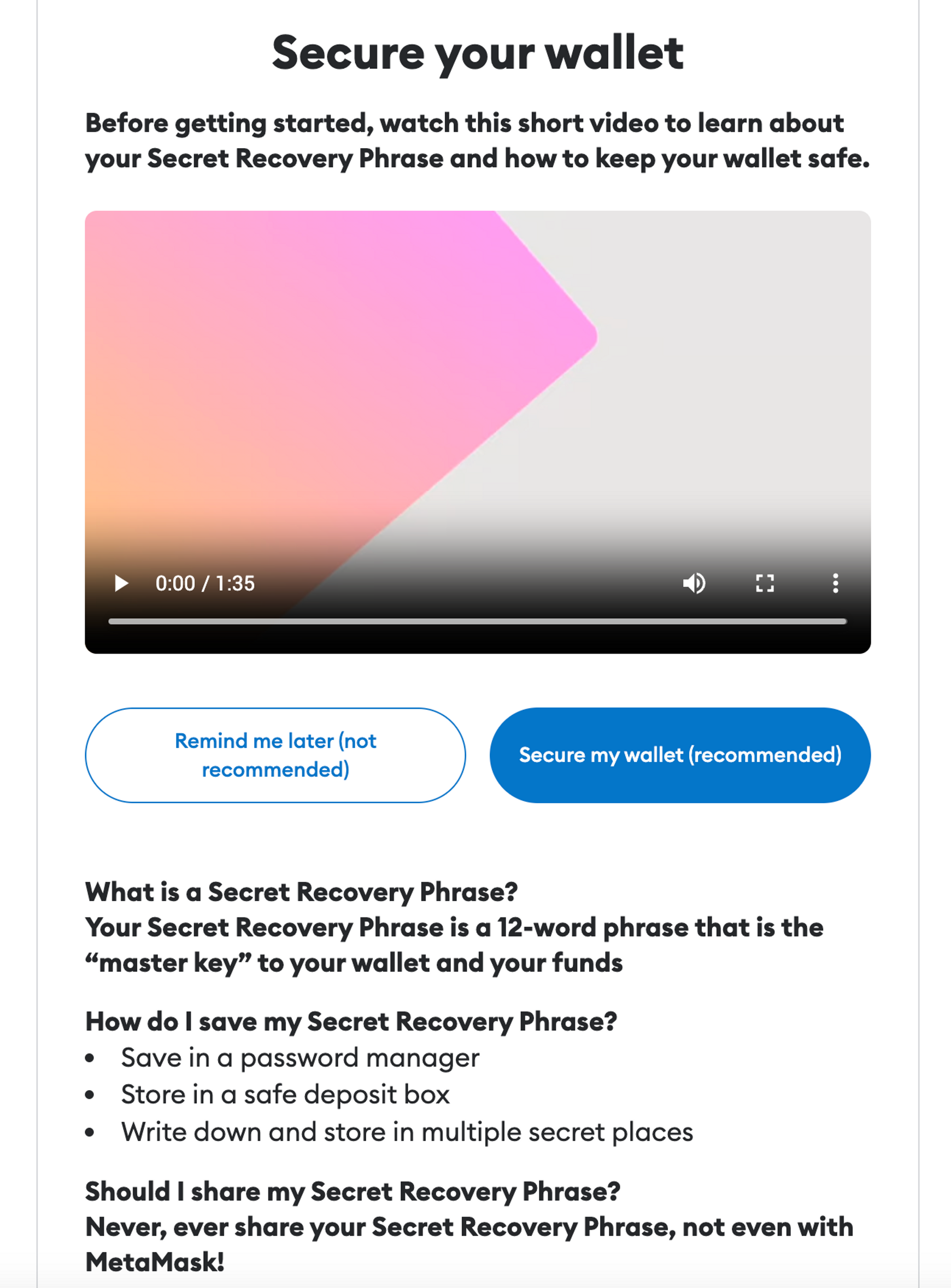 | 파란 버튼을 누른다 (Secure my wallet) | 여기서 메타마스크가 자동으로 12개의 단어(뉴모닉 구문)을 생성해준다. |
