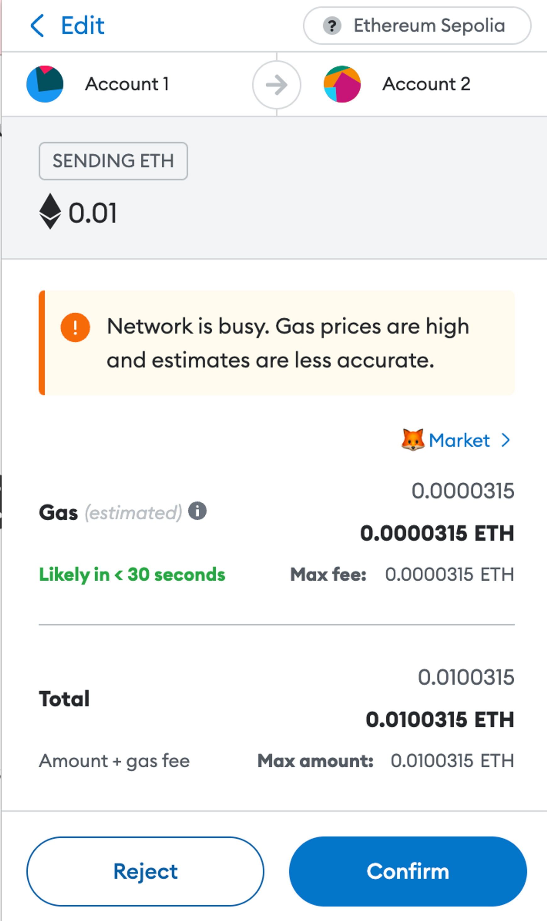 | 오른쪽 🦊Market> 을 누르면 가스비 조절 가능 | 이렇게 3가지 옵션이 뜨고 각자 트랜잭션이 처리되는 데 걸리는 소요시간과 가스비가 옆에 뜸 |