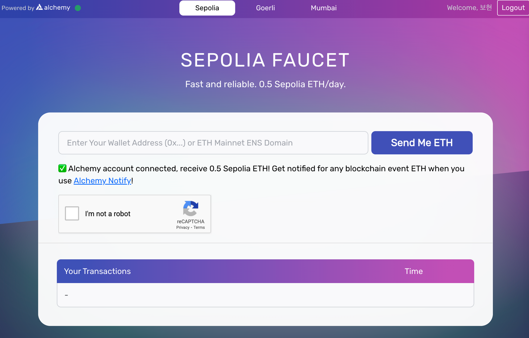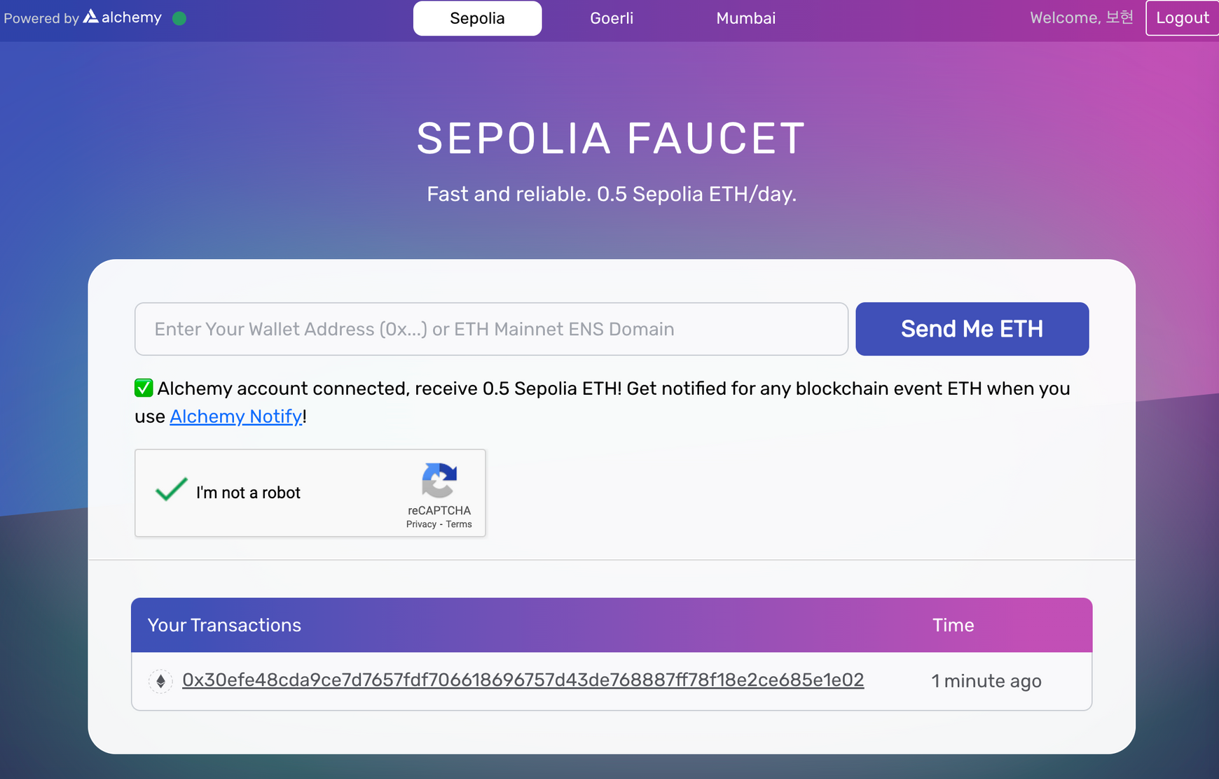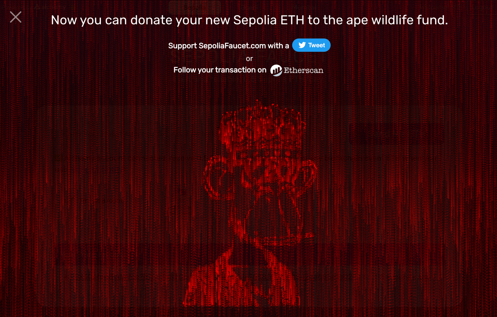 요청이 성공적으로 이루어졌다면, 아래와 같이 원숭이 유인원의 그림이 나타나고 "Your Transactions"에 방금 요청된 트랜잭션 해시가 기록된 것을 볼 수 있습니다.