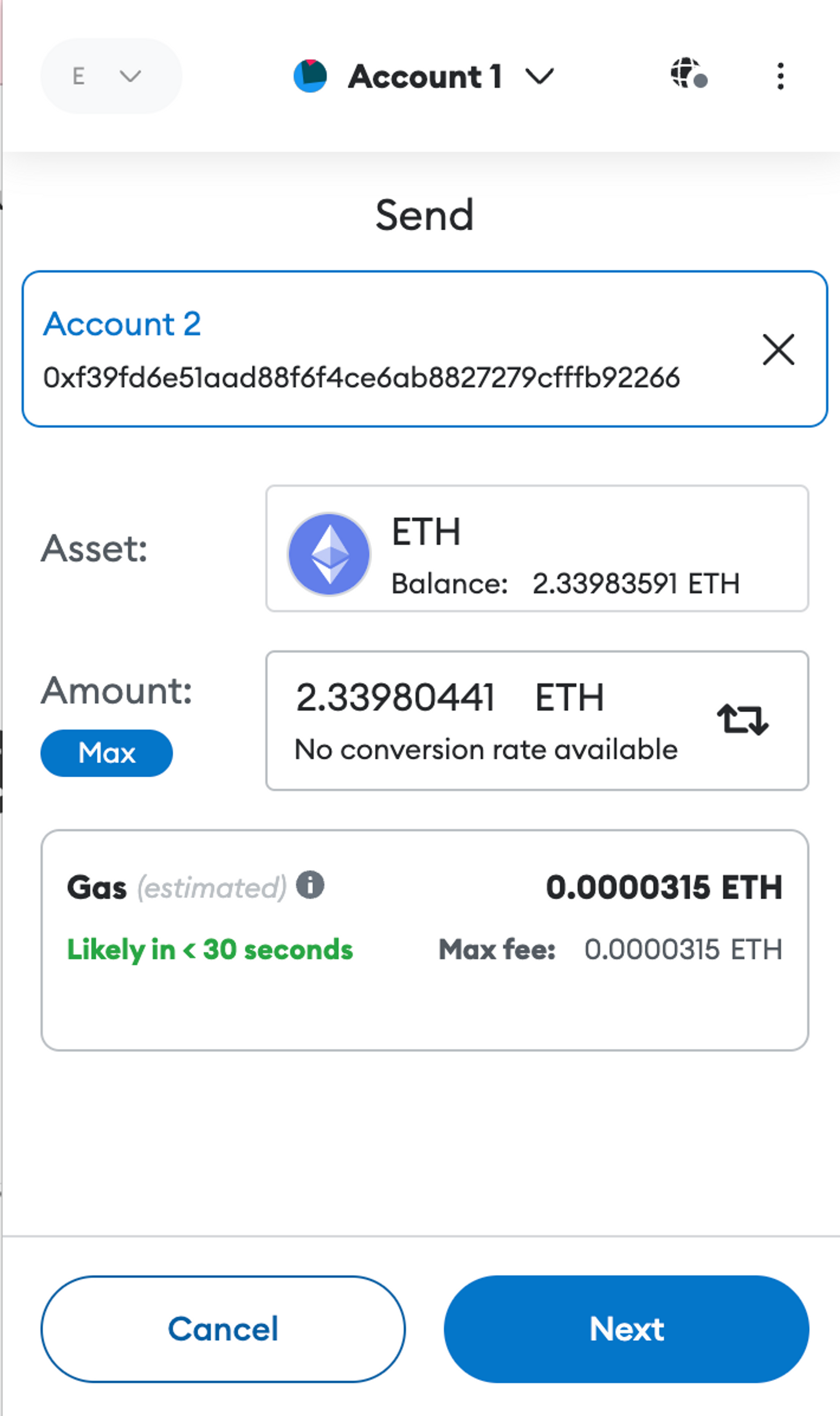 여기서 내 지갑에는 2.33983591 ETH가 들어있고, 가지고 있는 모든 이더를 보내려고 Max 버튼을 눌렀더니 보낼 수 있는 최대는 2.33980441 ETH라고 뜬다.
