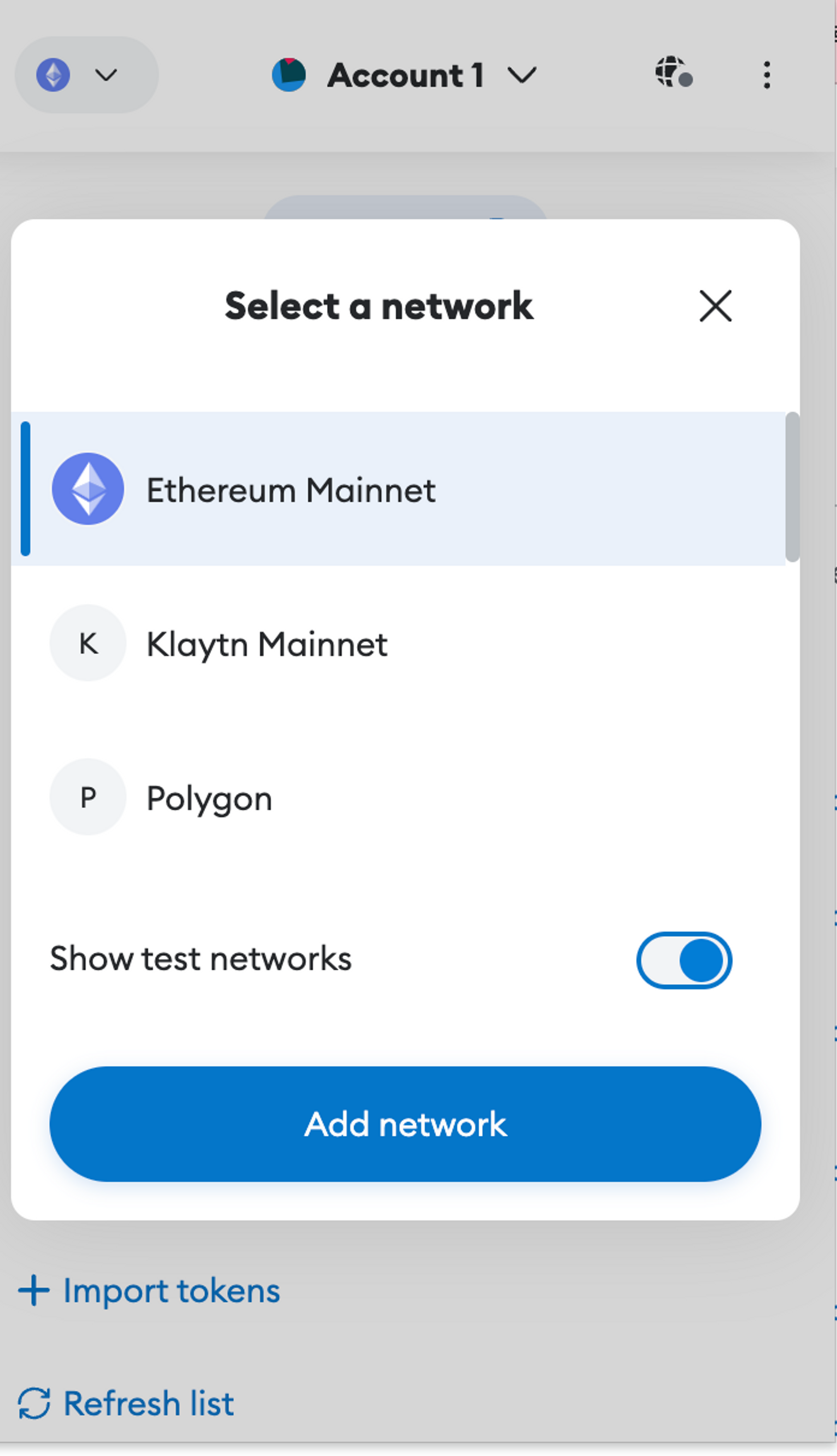 Klaytn(클레이튼), Polygon(폴리곤) 등 다른 블록체인을 포함해서 다양한 네트워크에 연결할 수 있다. 기본적으로 메타마스크는 이더리움 메인 네트워크에 연결을 한다.