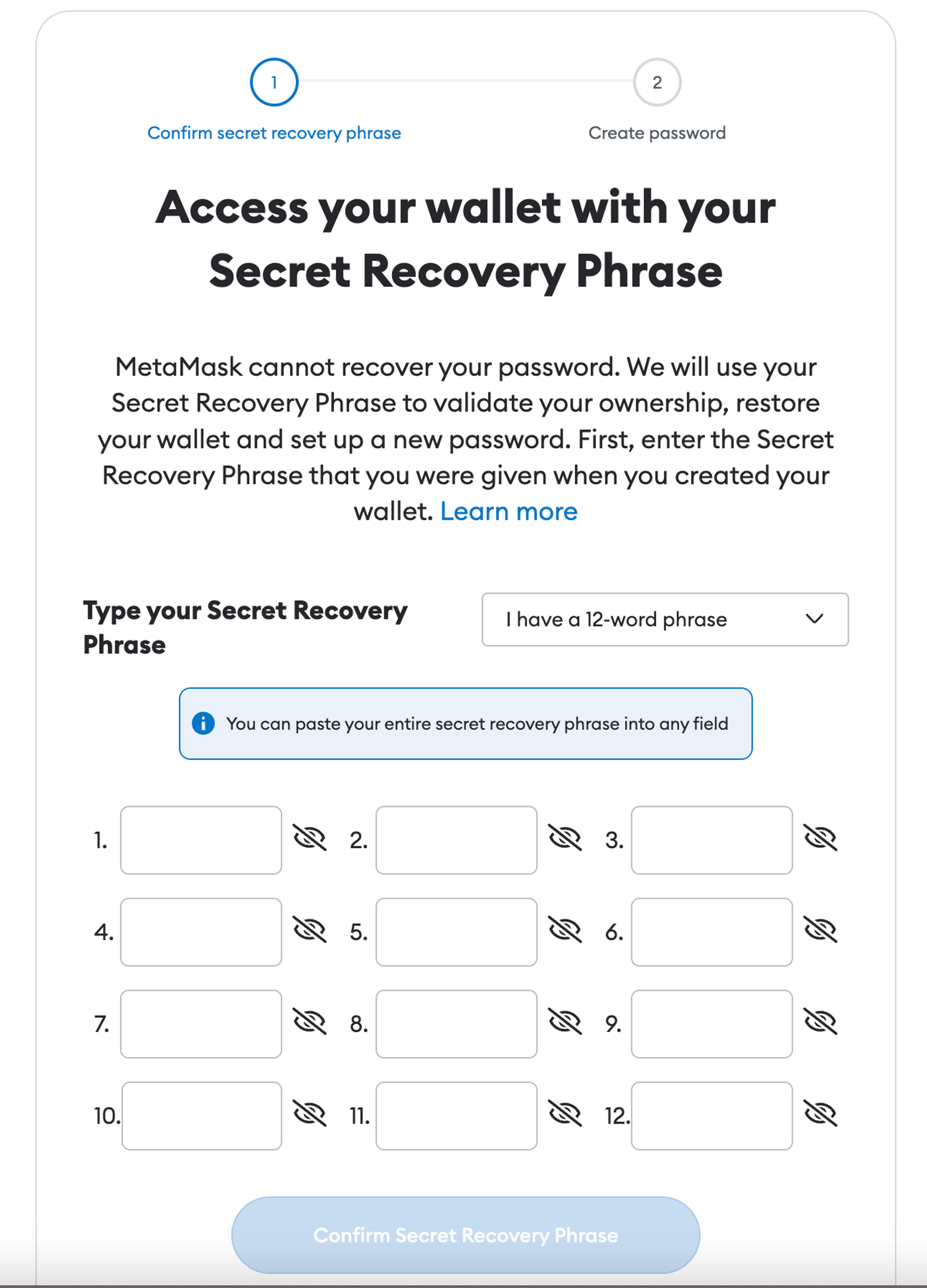 내 지갑을 복구하기 위해선 뉴모닉 구문이 필요하다. 아래에 전에 보관해두었던 뉴모닉 12개의 단어를 입력해준다.