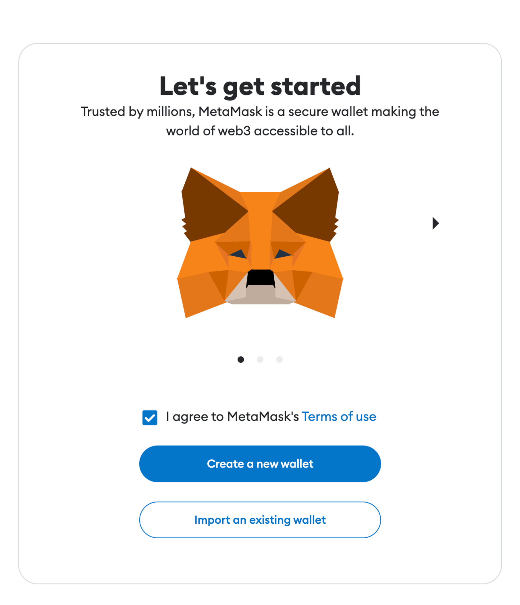 | 여우 머리 MetaMask가 상단바에 뜸 | 파란 버튼을 눌러 지갑 생성 시작 |