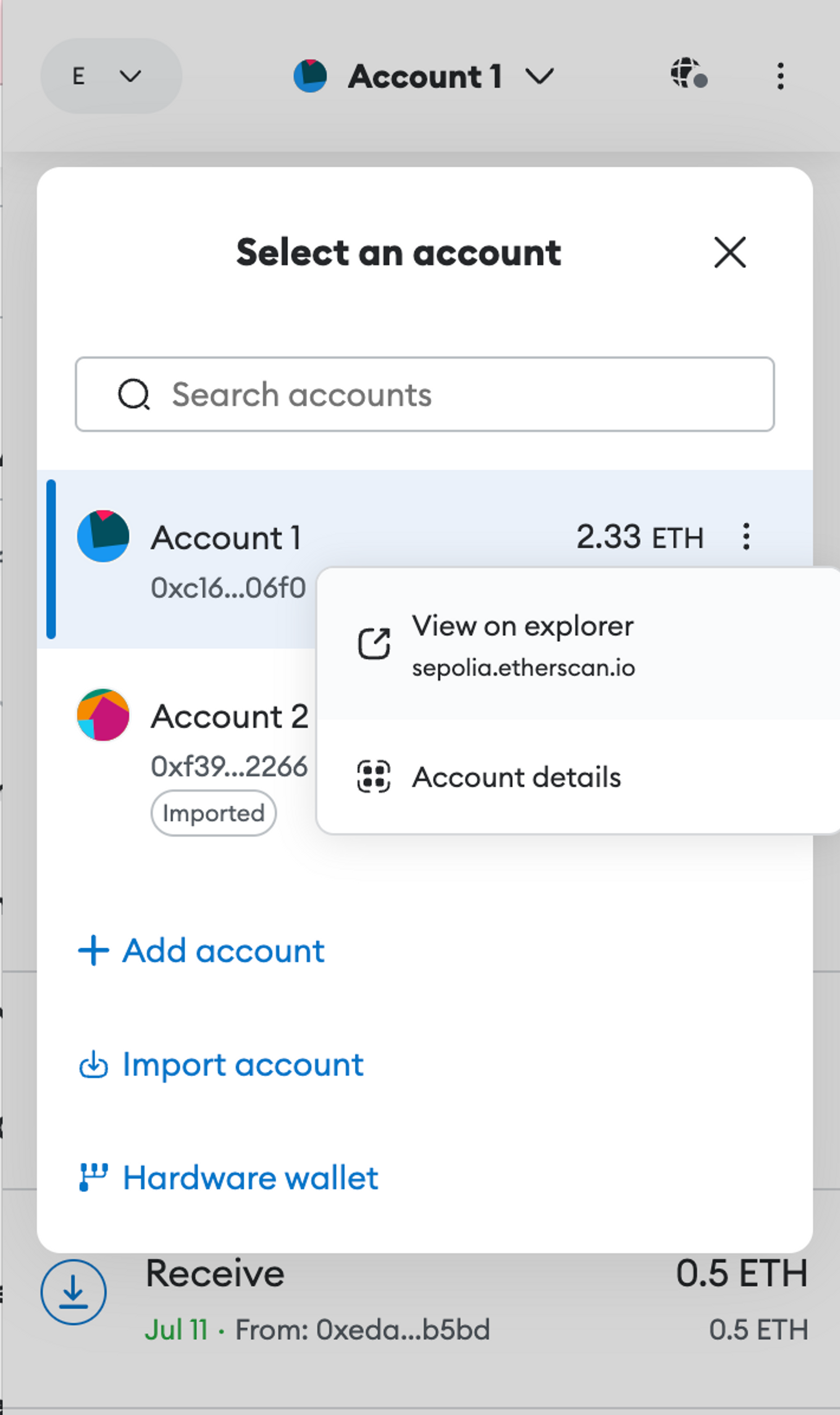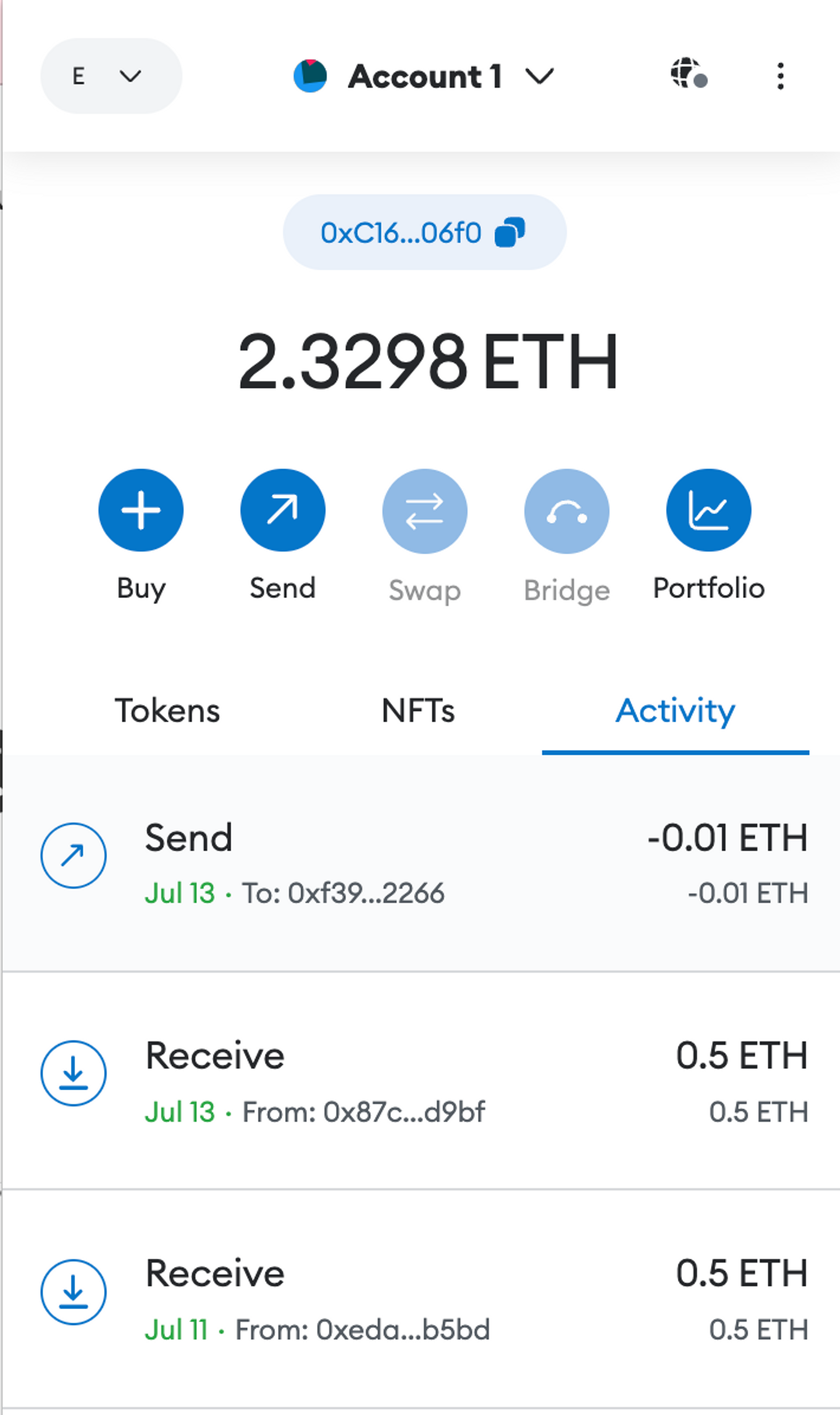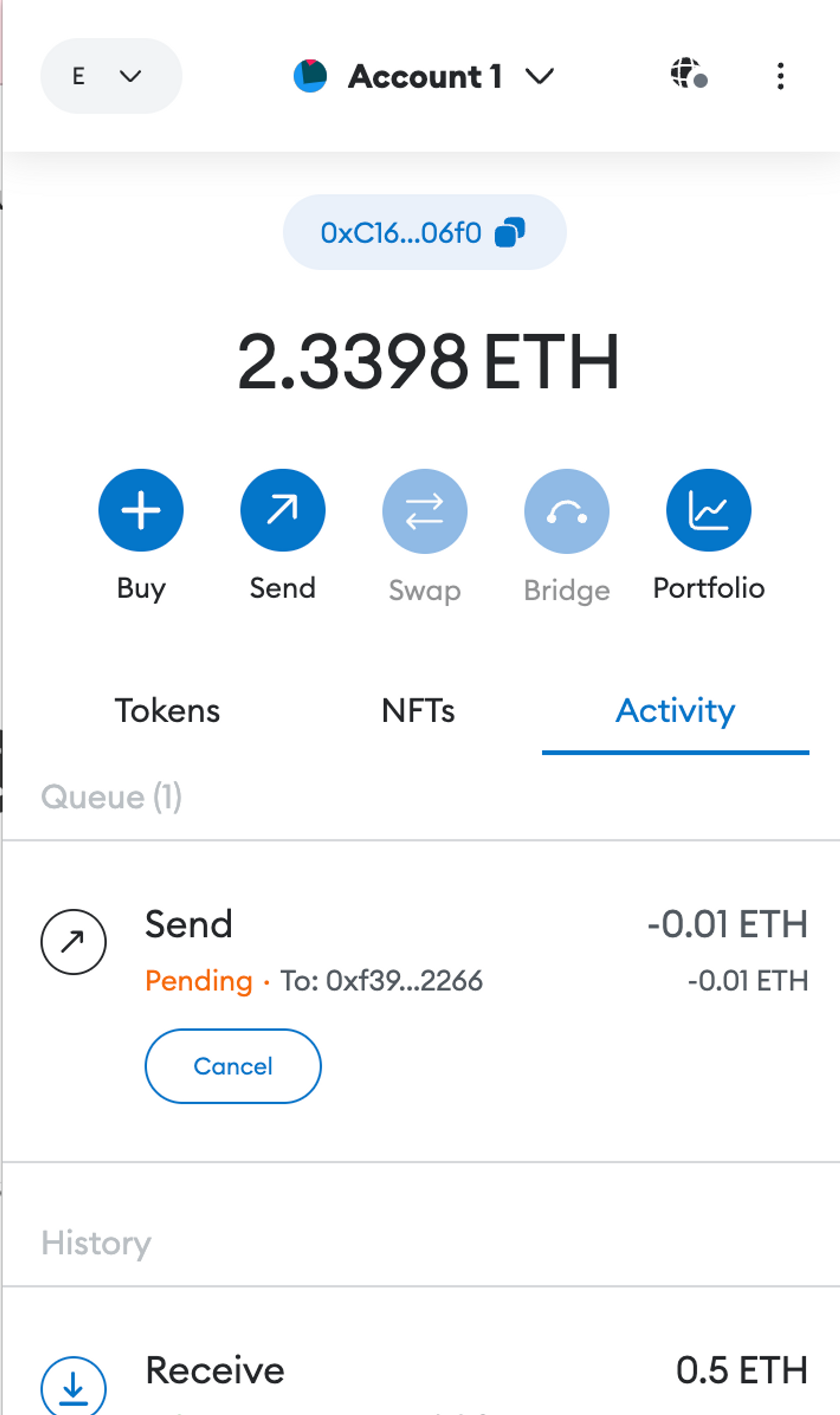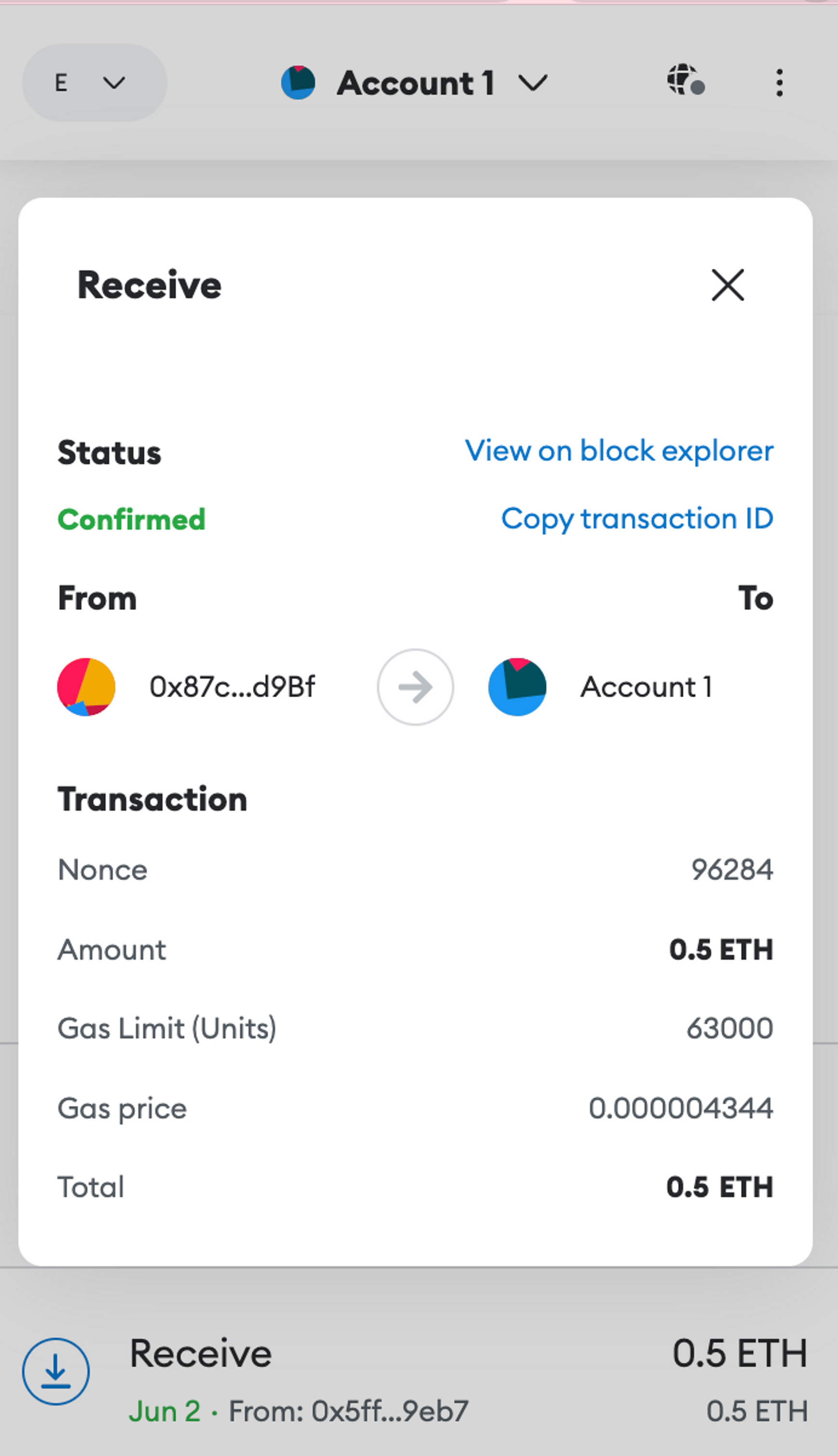 또한 아래와 같이 메타마스크에서 성공적으로 0.5이더를 받은 것을 확인할 수도 있습니다.