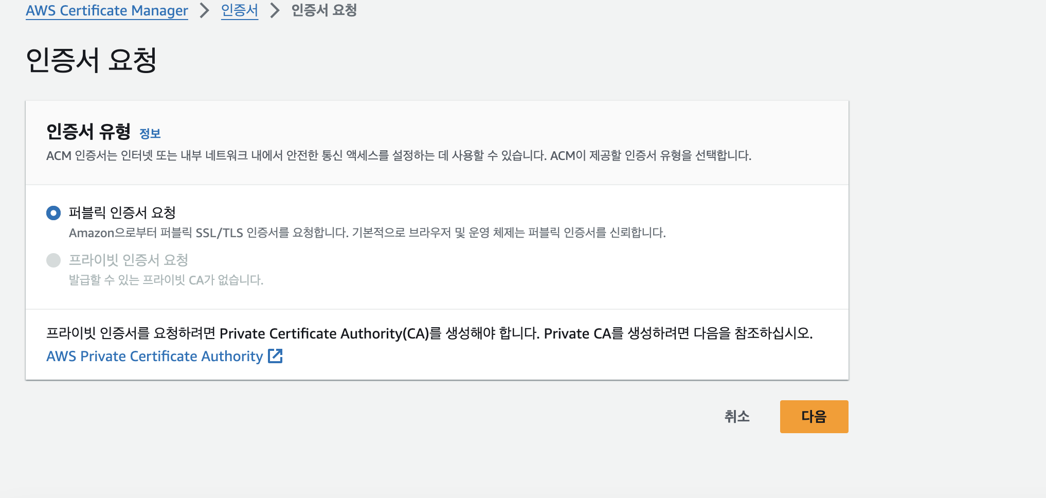 Route 53 도메인 적용까지 완료 했으면 이제 HTTPS를 적용하기 위해 Certification Manager를 통해 SSL/TLS 인증서를 발급해야 한다.