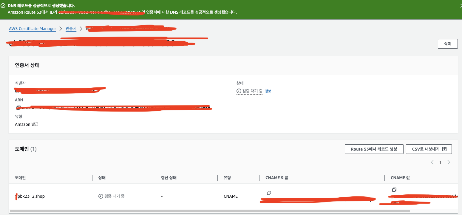이제 인증서 ID를 클릭하고 Route 53에 레코드 생성을 하면된다.