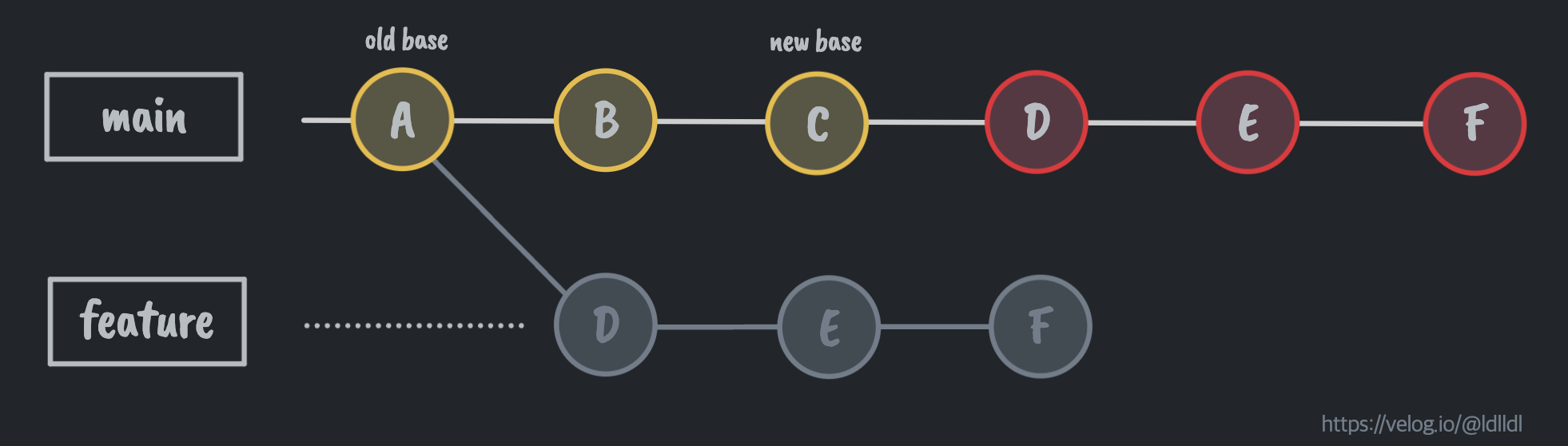 feature ๋ธ๋์น์ ์ปค๋ฐ ๋ด์ฉ์ main ๋ธ๋์น์ ์ฌ๋ฐฐ์นํ๊ณ ์ถ๊ฐ ์ปค๋ฐ ์์ด ๋ณํฉํ๋ ๋ฐฉ์merge๋ฅผ ํ๋ฉด base๊ฐ ๋ฐ๋์ง๋ ์์ง๋ง, rebase๋ ๋จ์ด ๊ทธ๋๋ก base๋ฅผ ๋ฐ๊ฟ์ ๋ณํฉgit checkout feature