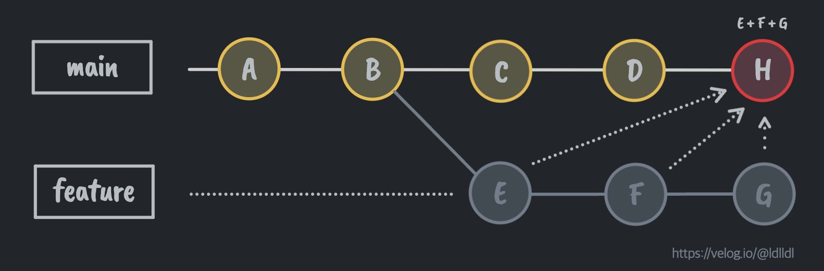 main ๋ธ๋์น์์ feature ๋ธ๋์น๋ฅผ ๋ถ๊ธฐํจfeature ๋ธ๋์น์์ ์๋ฌด ์ปค๋ฐ๋ ํ์ง ์์feature ๋ธ๋์น๋ฅผ main์ ๋จธ์งํจ๐ ๊ทธ๋ผ ์ด๋ป๊ฒ ๋ณํฉ๋ ๊น?