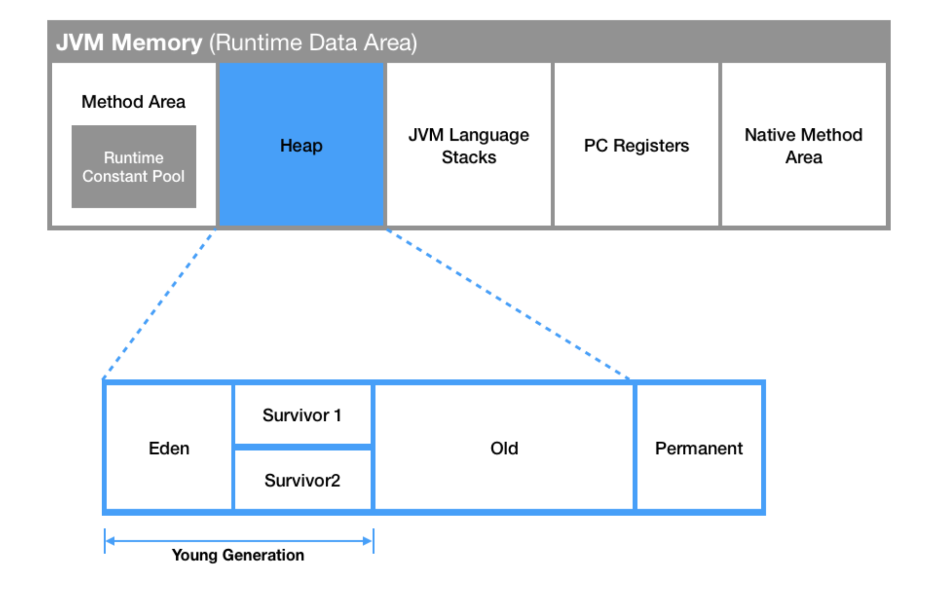 🤔 Young Generation 영역은 짧게 살아남는 메모리들이 존재하는 공간이다. 모든 객체는 처음에는 Young Generation에 생성된다. Young Generation의 공간은 Old Generation에 비해 상대적으로 작아서, 메모리 상의 객체를 찾아 제거하는 데 시간이 적게 걸린다. (작은 공간에서 데이터를 찾으니까) 이 때문에 Young Generation에서 발생하는 GC는 Minor GC라고 불린다.