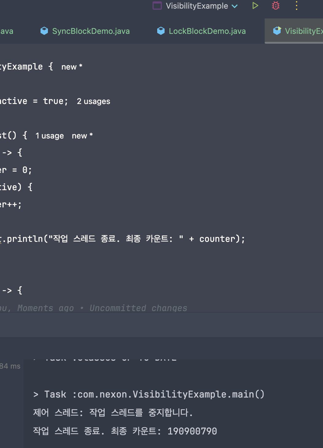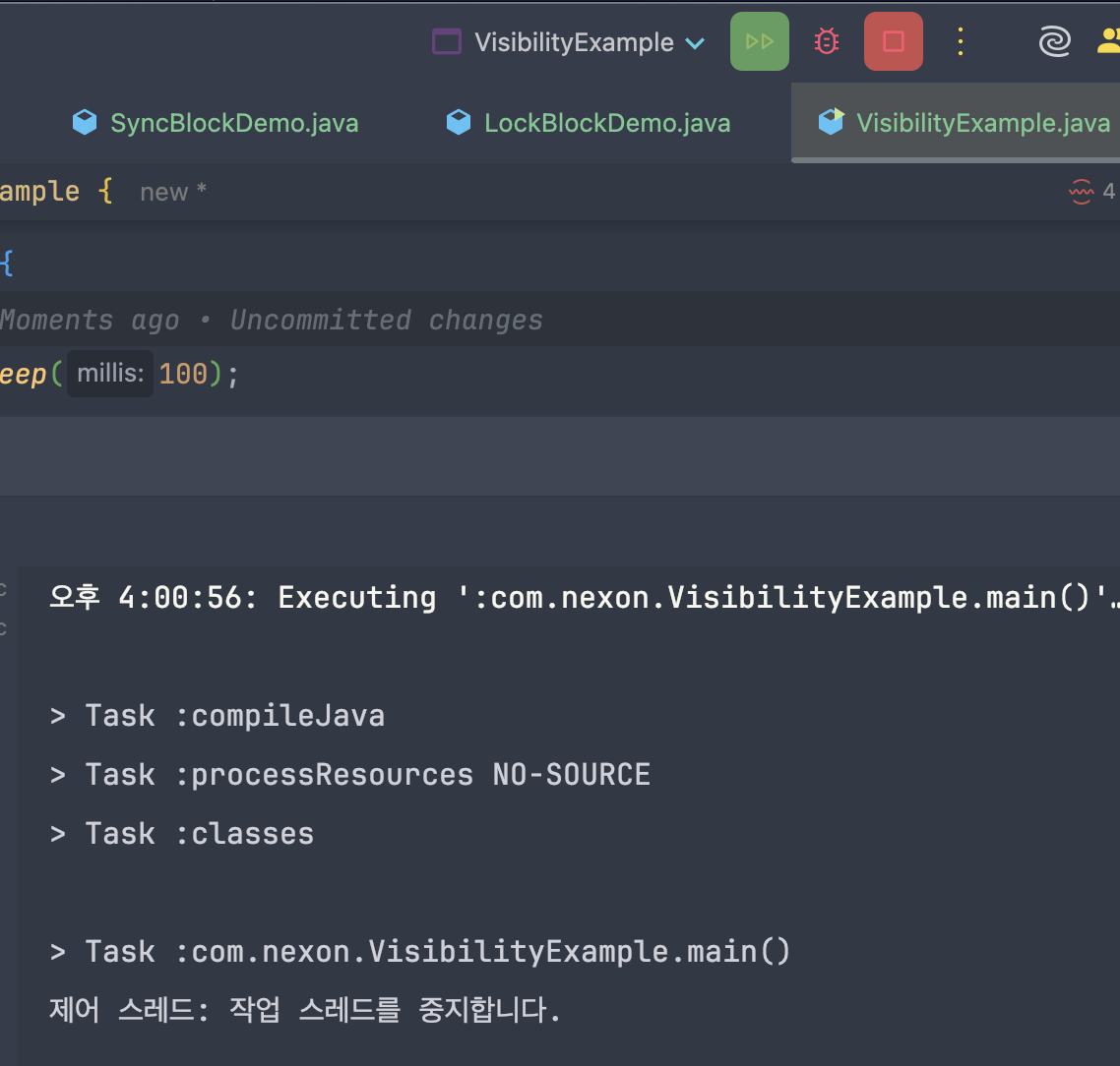 μ°λ¦¬λ λ λ²μ§Έ μ€λ λκ° μ€νλλ©΄ 첫 λ²μ§Έ μ€λ λμ 무ν 루νκ° μ’ λ£λκ³ "μμ μ€λ λ μ’ λ£. μ΅μ’ μΉ΄μ΄νΈ: " + counter κ° μΆλ ₯λ κ²μΌλ‘ μμνλ€.