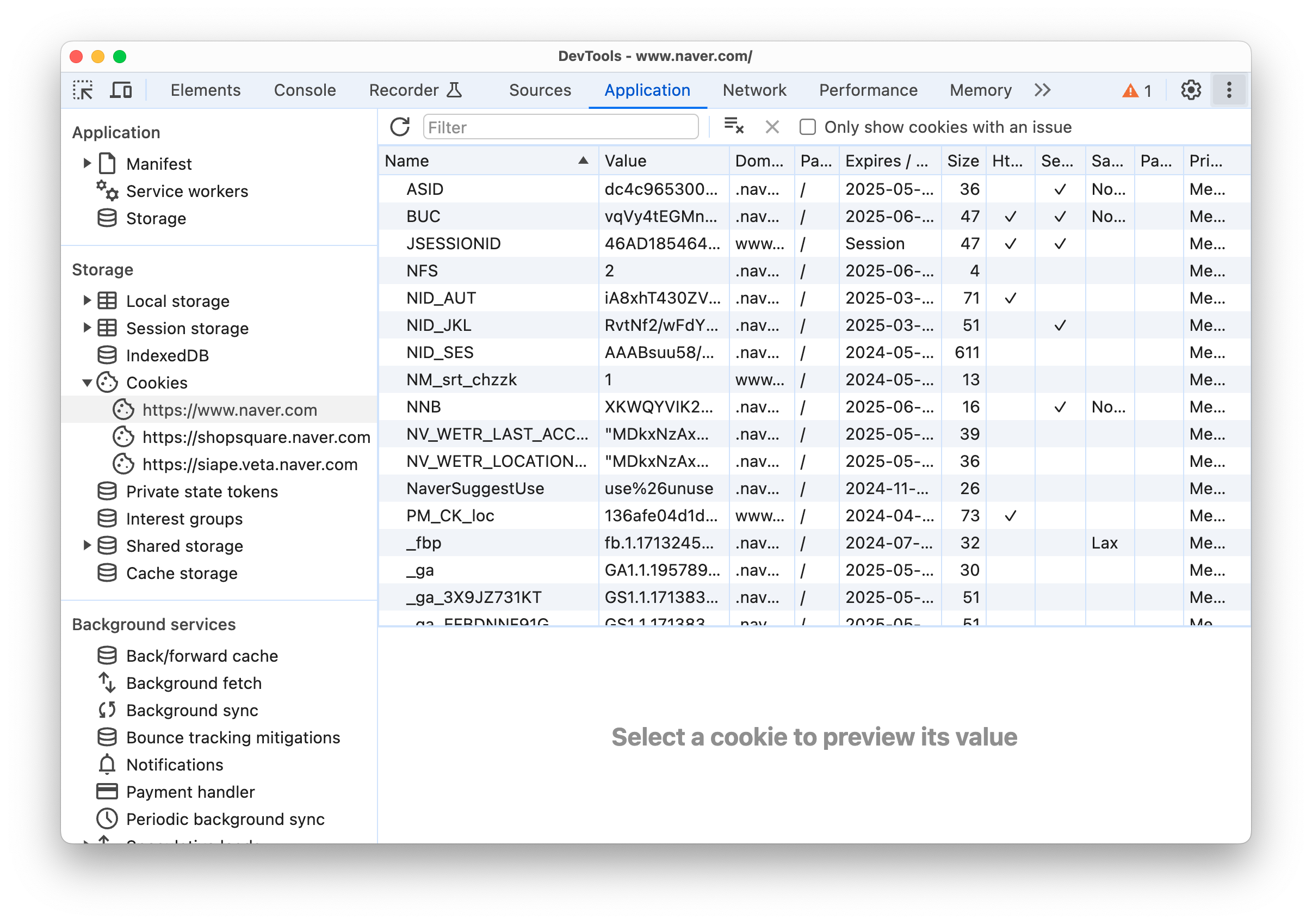 (naver.com에 접속하였을 때 아래 같이 Cookie가 저장 되었음을 확인할 수 있다.)