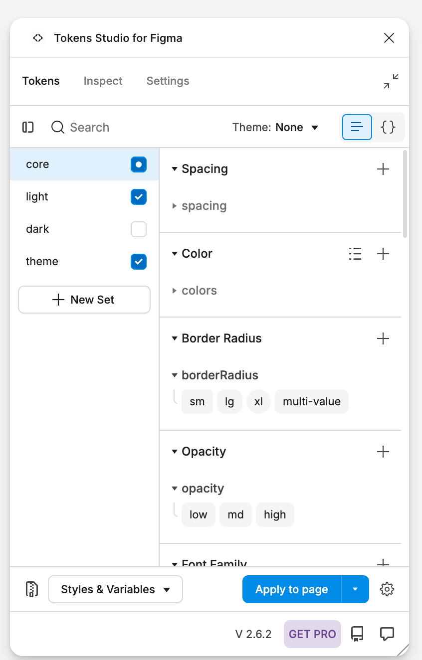 Token Studio 에서는 Color, Typography, Spacing, Shadow 등 다양한 타입의 토큰을 지원하며, 각각을 세트라는 큰 개념으로 분류하여 관리할 수 있다.