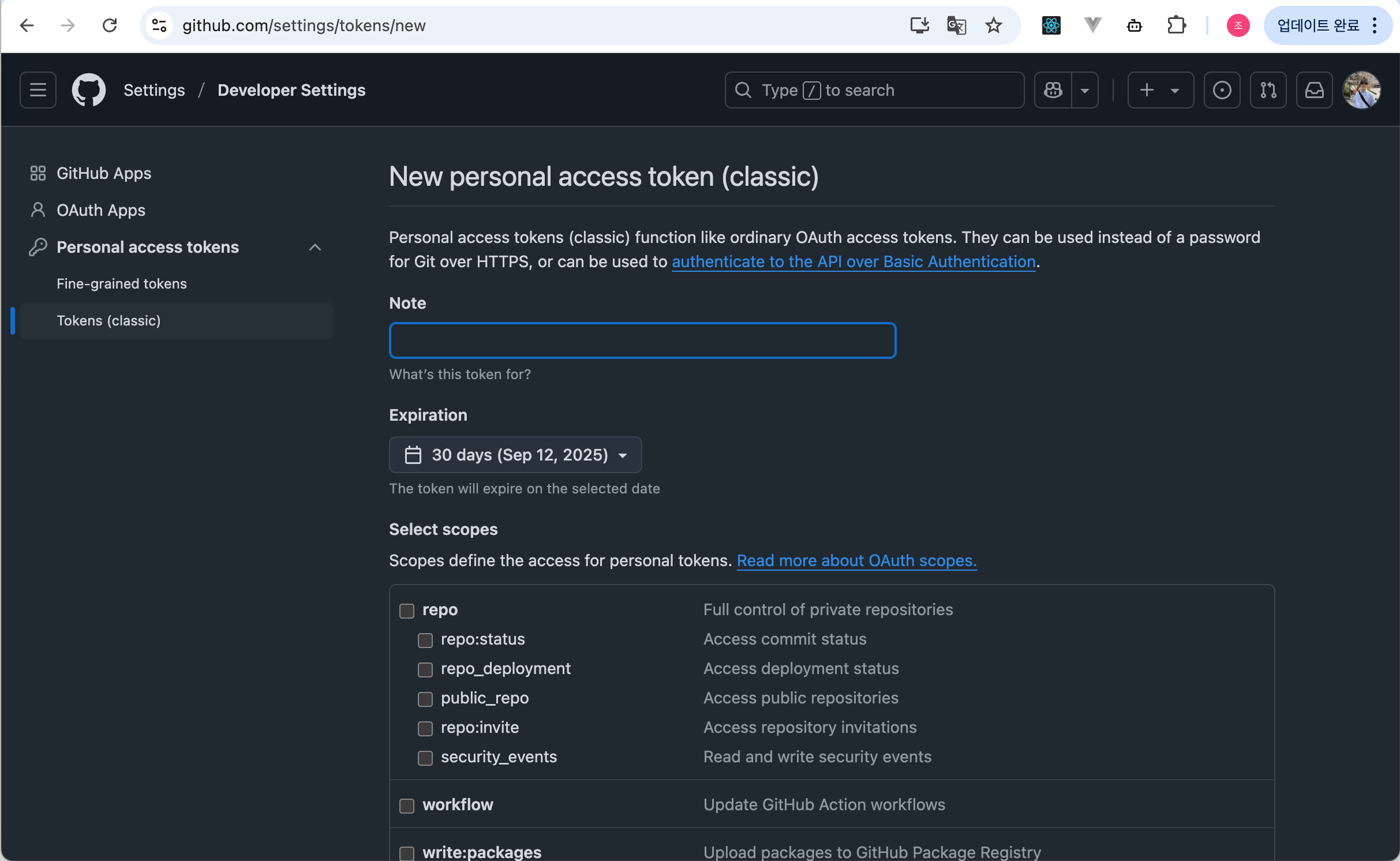 settings → Developer settings → Personal access tokens → Tokens (classic)