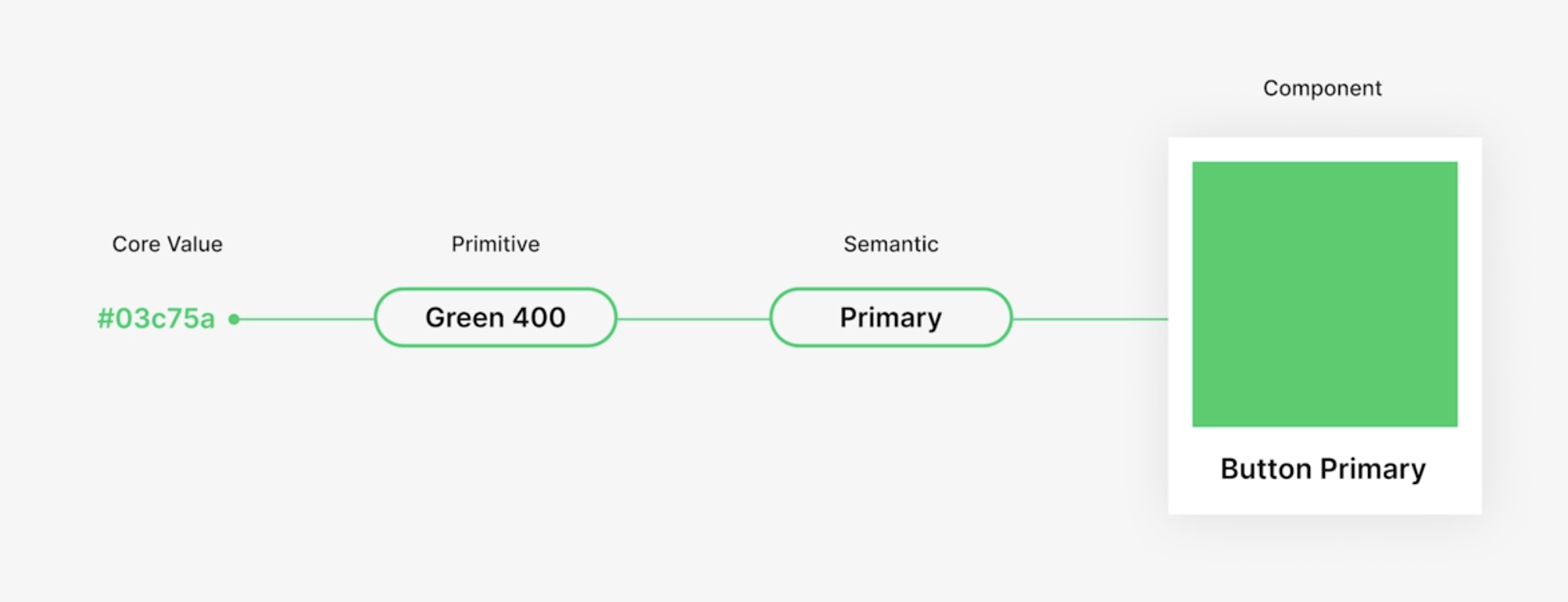 #3f3se3Green-400Primary, main, backgroundButton이렇게 각각의 의미와 구체적인 범위에 따라서 표현할 수 있는 방법에 따라 각각의 토큰으로 만들 수 있다. 그래서 각각을 만들어 표현할 때 Primitive 토큰, Semantic 토큰, Component 토큰 이라고 정의할 수 있다.