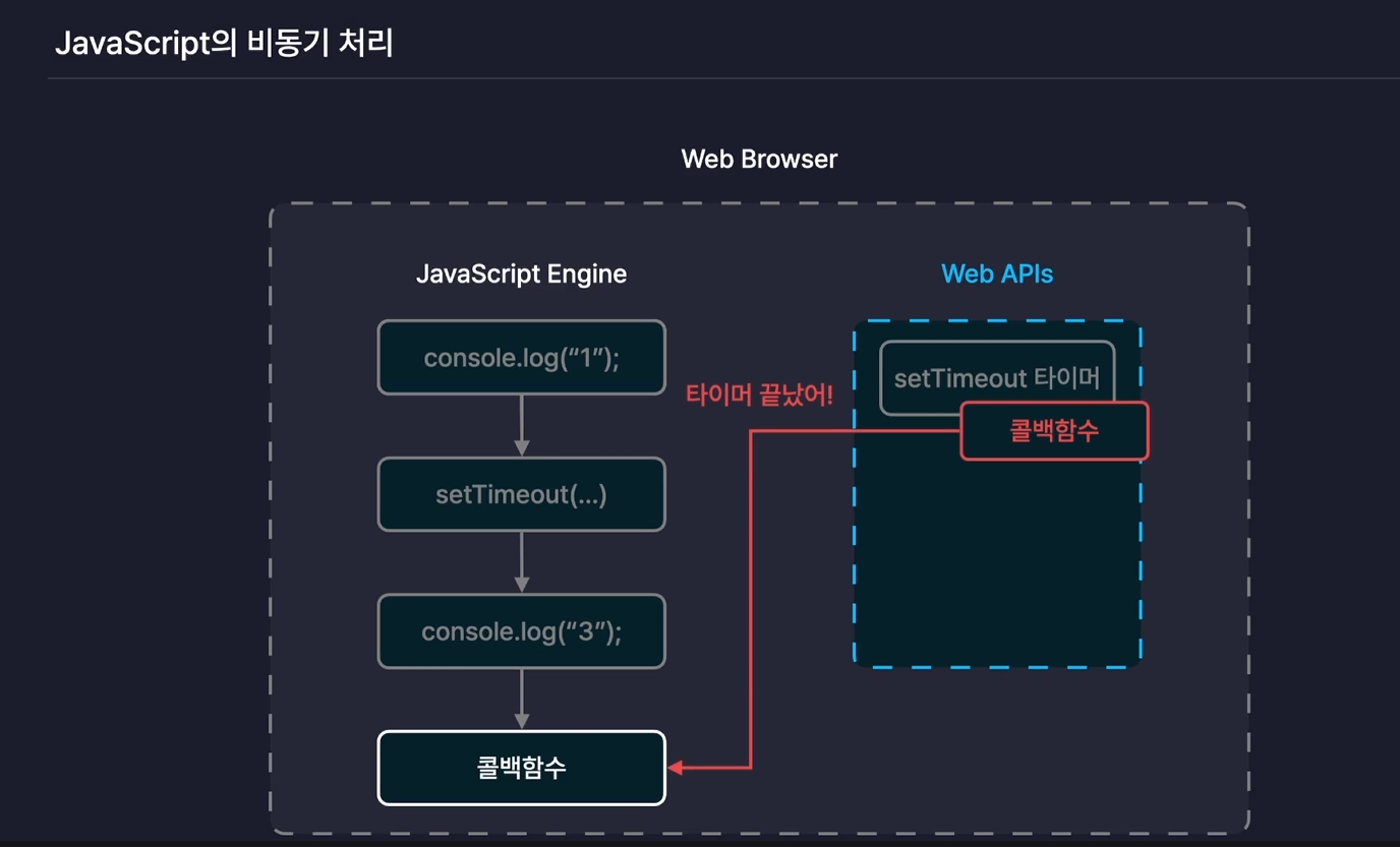 자바스크립트의 쓰레드가 특별한 기능을 가지고 있는 게 아니기 때문에, 자바스크립트는 동기적으로 코드를 실행하다가 비동기 함수를 만나면 웹 브라우저의 별도영역인 웹 APIs에게 처리를 부탁한 후 기다리지 않고 다음 코드를 실행한다. 웹 APIs는 처리가 끝나면 자바스크립트에게 코드를 돌려주고, 그제서야 비동기 함수는 실행이 된다.